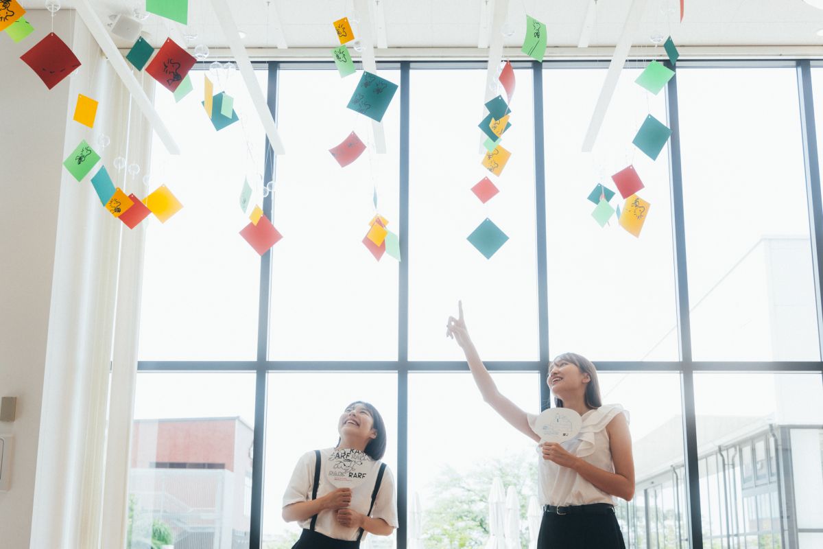 スヌーピーのモニュメントを通り抜けると、100個を超えるカラフルな風鈴が迎えてくれます。入った瞬間、ひんやりとした世界の始まりです! たくさんの短冊のなかには、かわいく飛び跳ねるウッドストックも。スヌーピーたちに囲まれて素敵な写真が撮れるスポットもありますよ♪