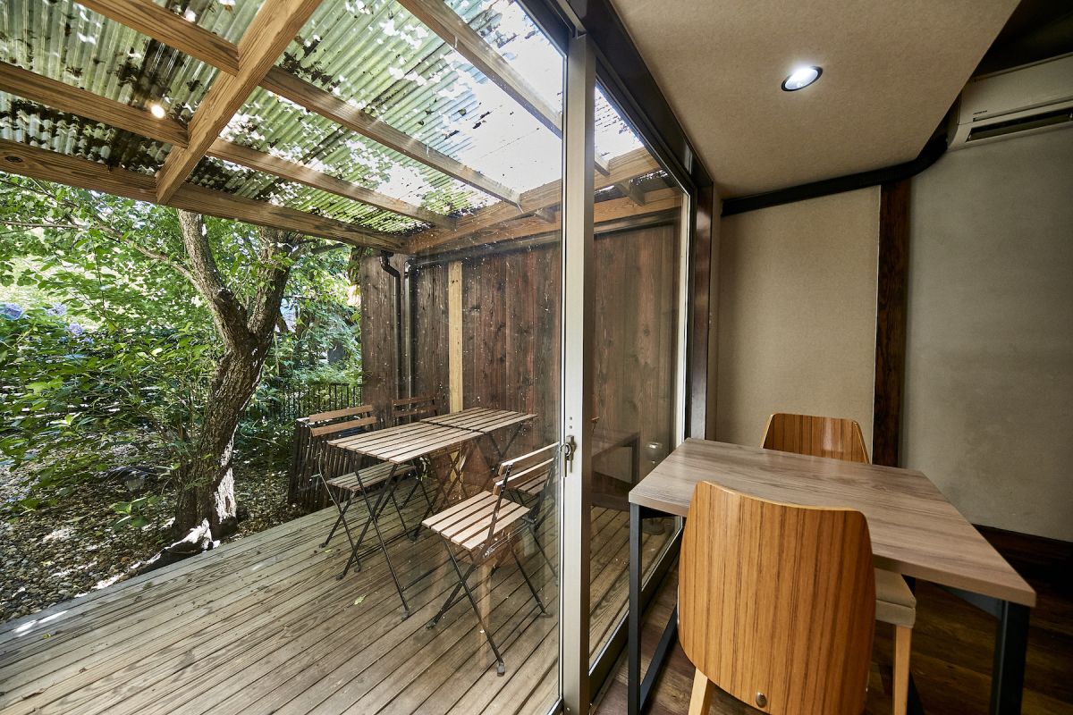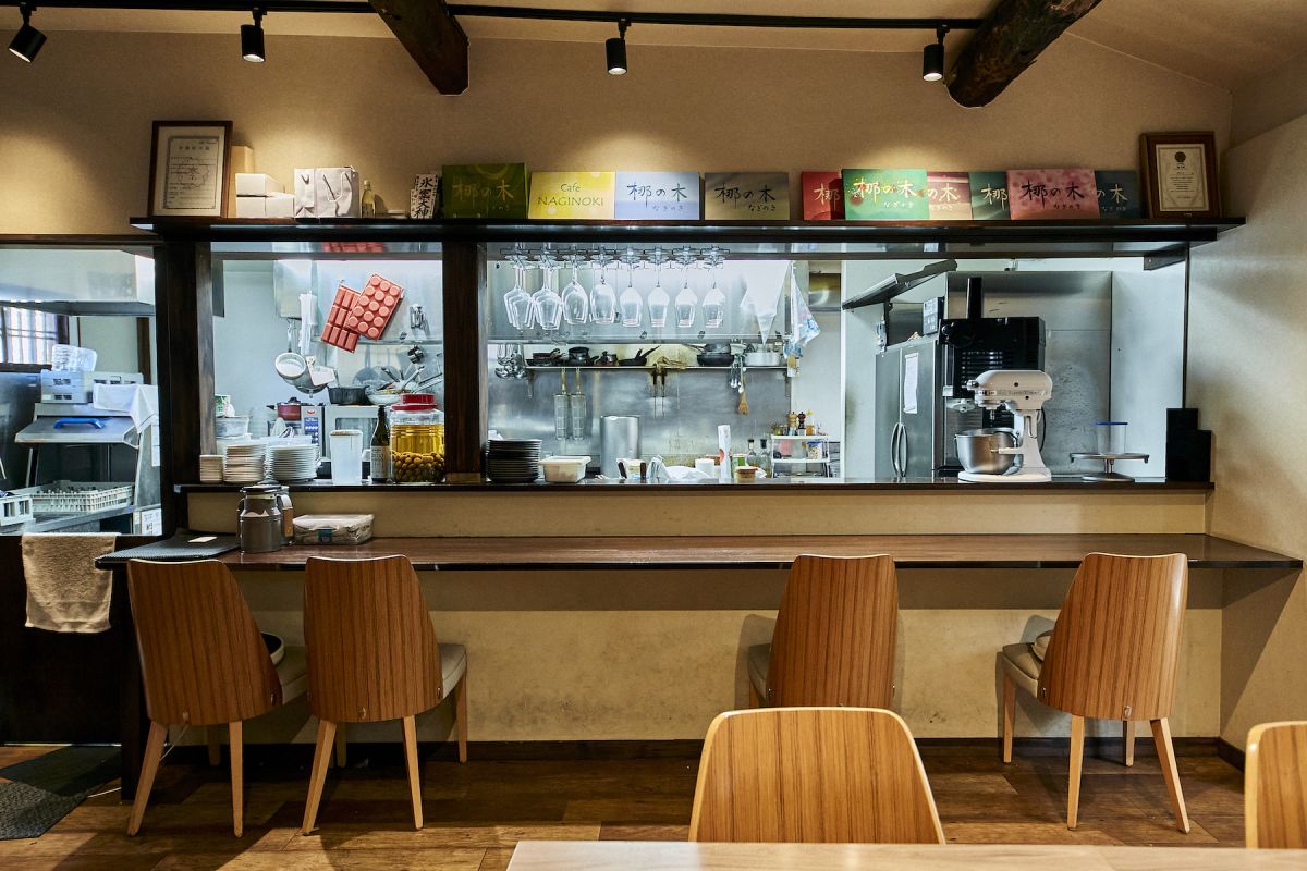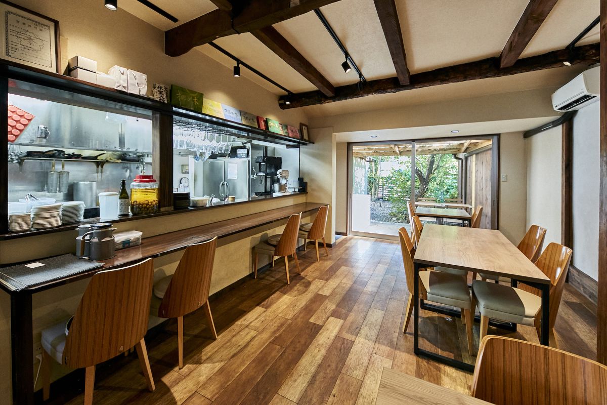 店に一歩入ると、奥の庭の緑が眩しく、広々とした空間が広がります。フローリングの床や天井まで貼られたクリーム色の壁紙が品よく、落ち着くことこの上なし。