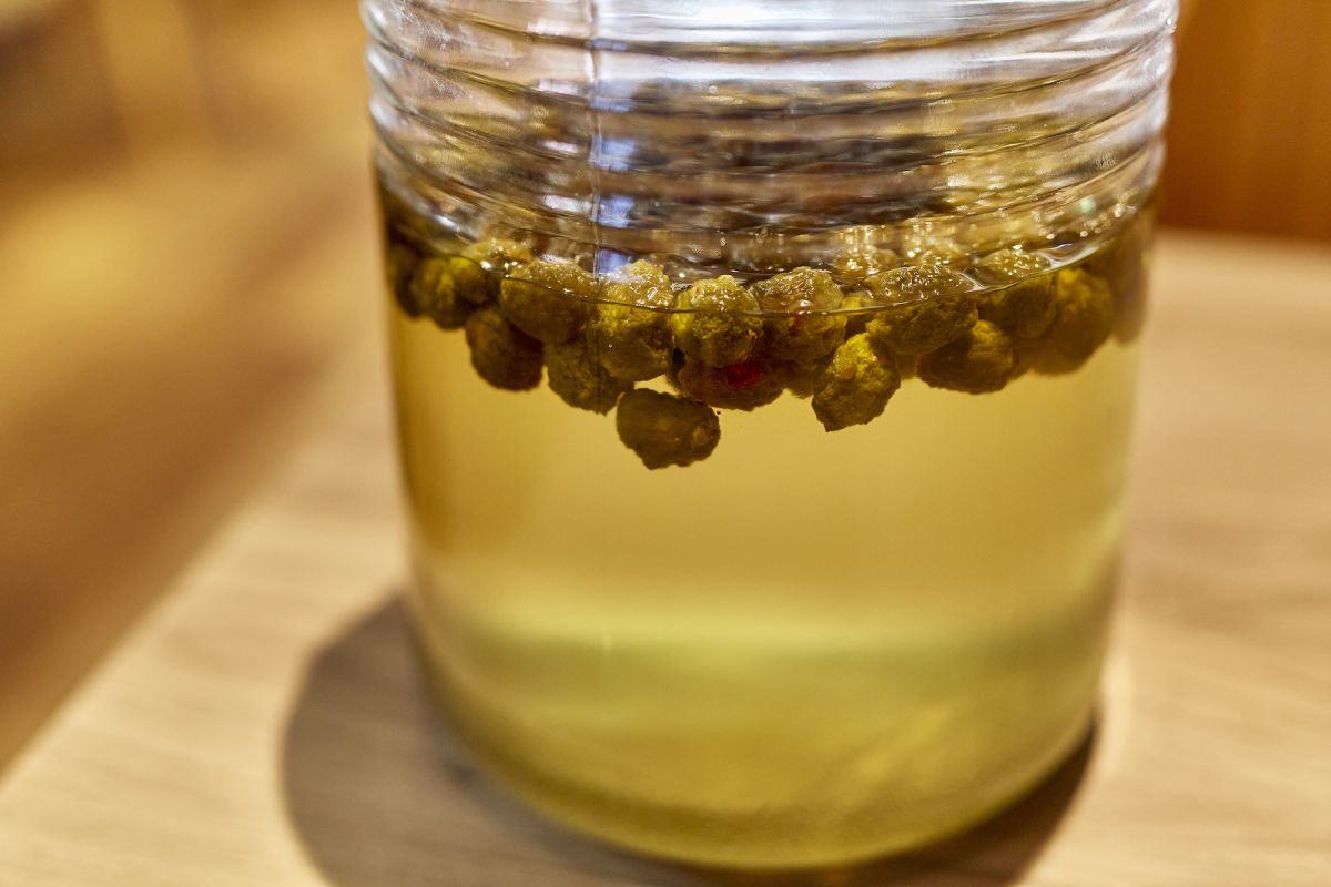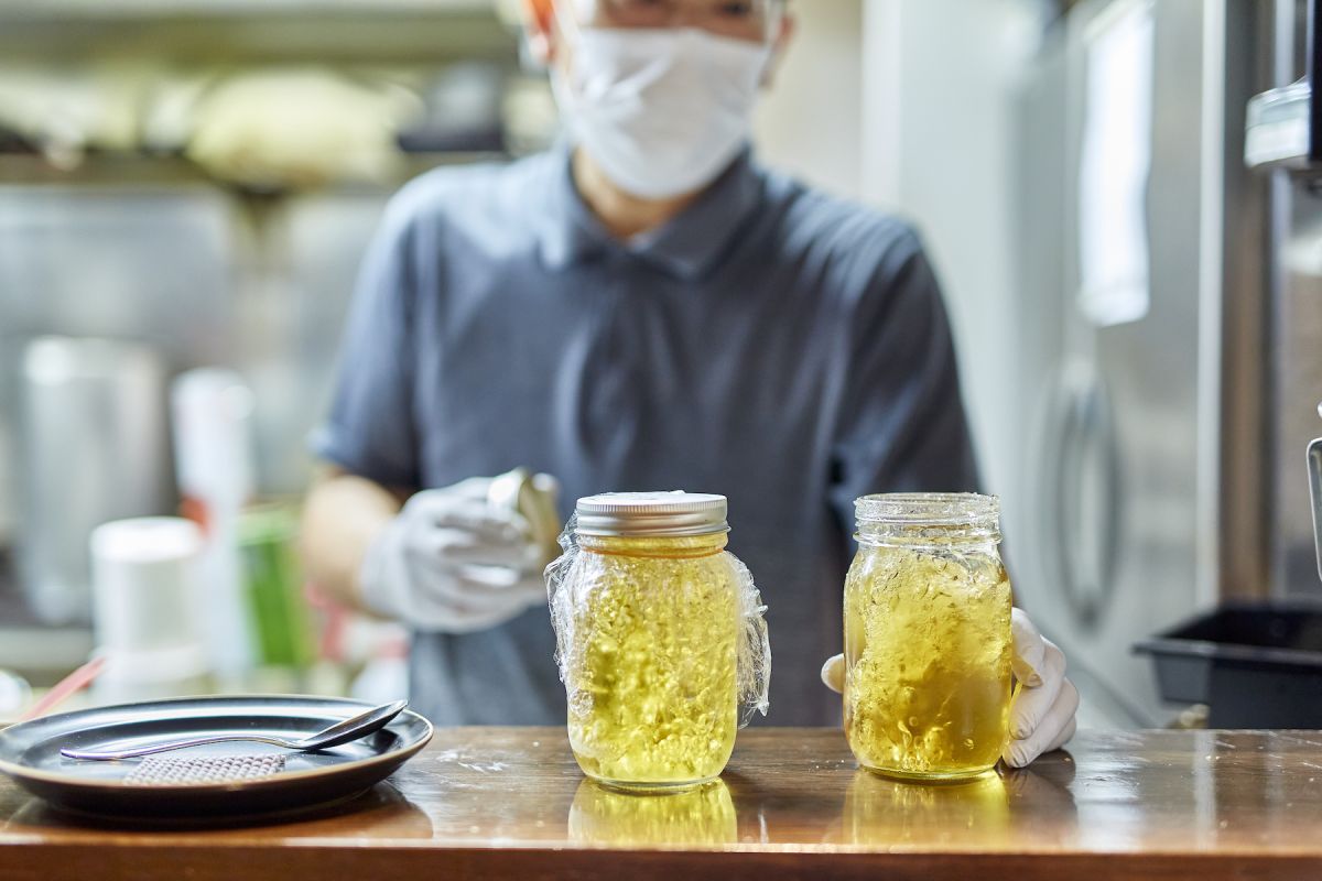 こちらが自家製の梅シロップ。梅のエキスが氷砂糖と混じり合い、琥珀色の液体に。しっかりとエキスが出きった後の梅がしわしわになってシロップの上に浮かんでいます。