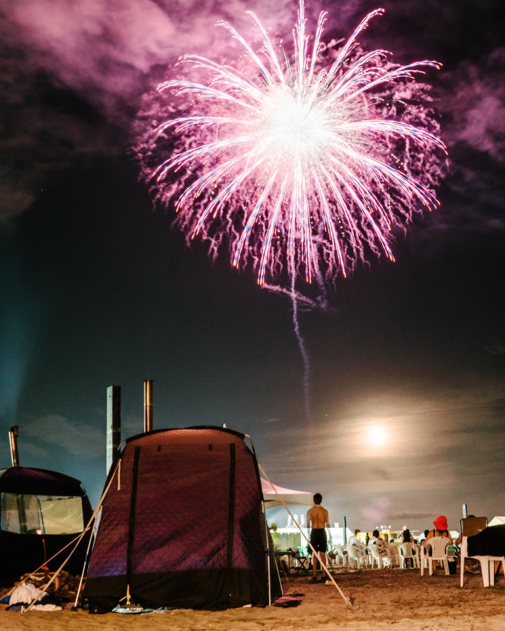 サウナテントから出たら、夜空に上がる花火が……そんな最高のシチュエーションもこのフェスならでは。ビーチで究極のととのい体験ができるぜいたくなひと時をこの機会に楽しんでみて♪