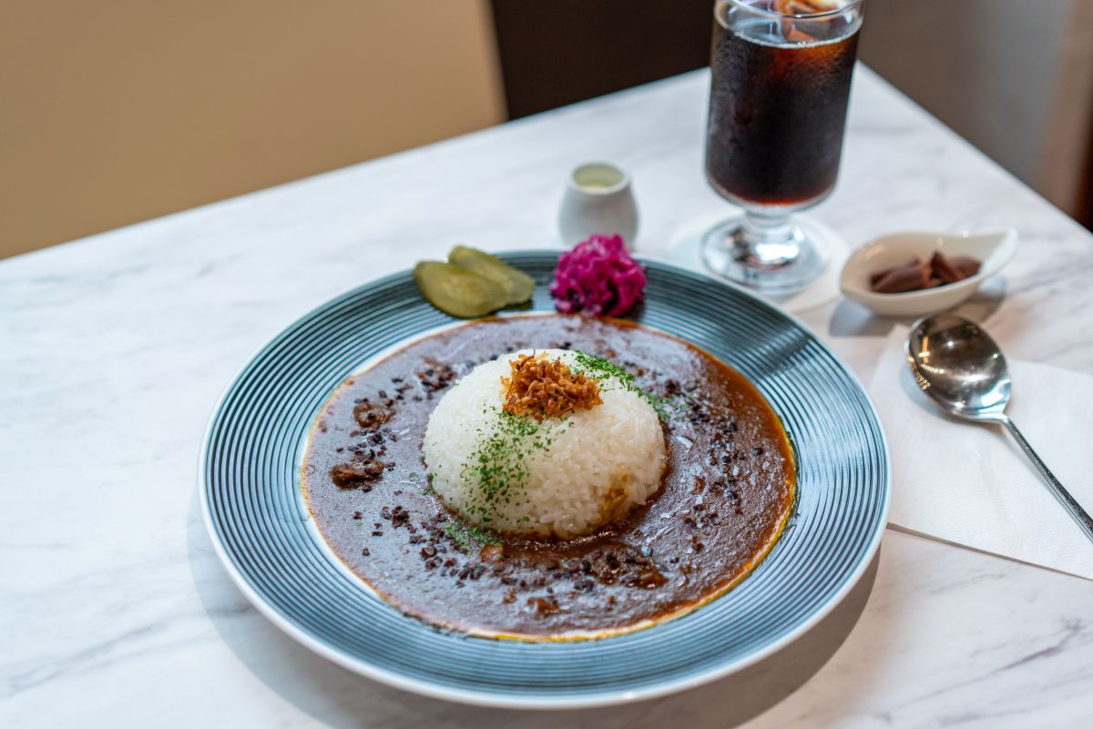 カフェのランチメニューのメインはカレー。今回オーダーしたのは「カカオカレー 牛すじとソテーオニオン」1200円(ランチタイム11〜14時の提供。ドリンク付き)です。じっくり煮込んだとろとろ牛すじと辛口のルーがあと引くおいしさです!