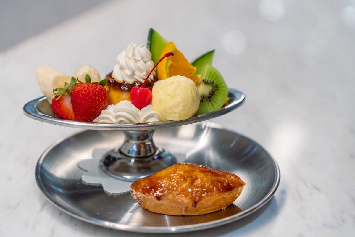 「ル・モンブラン・カフェ」で新登場したスイーツメニューがこちらの「横濱王道プリンア・ラ・モード・スペシャル」1430円。横浜発祥であるプリンア・ラ・モードに、焼きたての「ブリュレハーバー」をトッピングした、横浜らしいひと品です。美しく盛り付けられたフルーツの数々とプリン、「ブリュレハーバー」とどれから食べようか思わず目移りしてしまいます……。