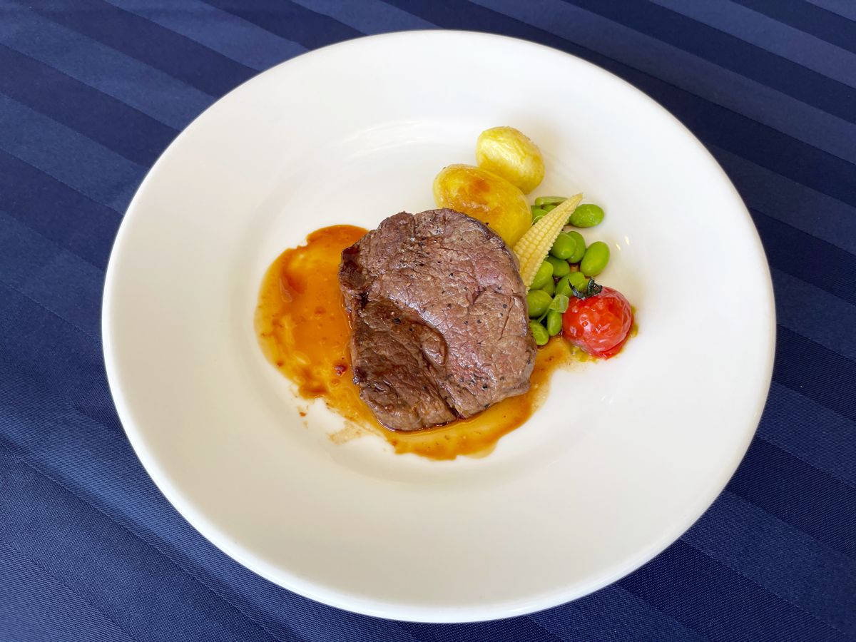 メインは魚料理と肉料理から選べますが、今回は肉料理をチョイス。「牛フィレ肉のポワレ 和風ソース 季節の野菜」は、見た目も華やかなひと皿です。