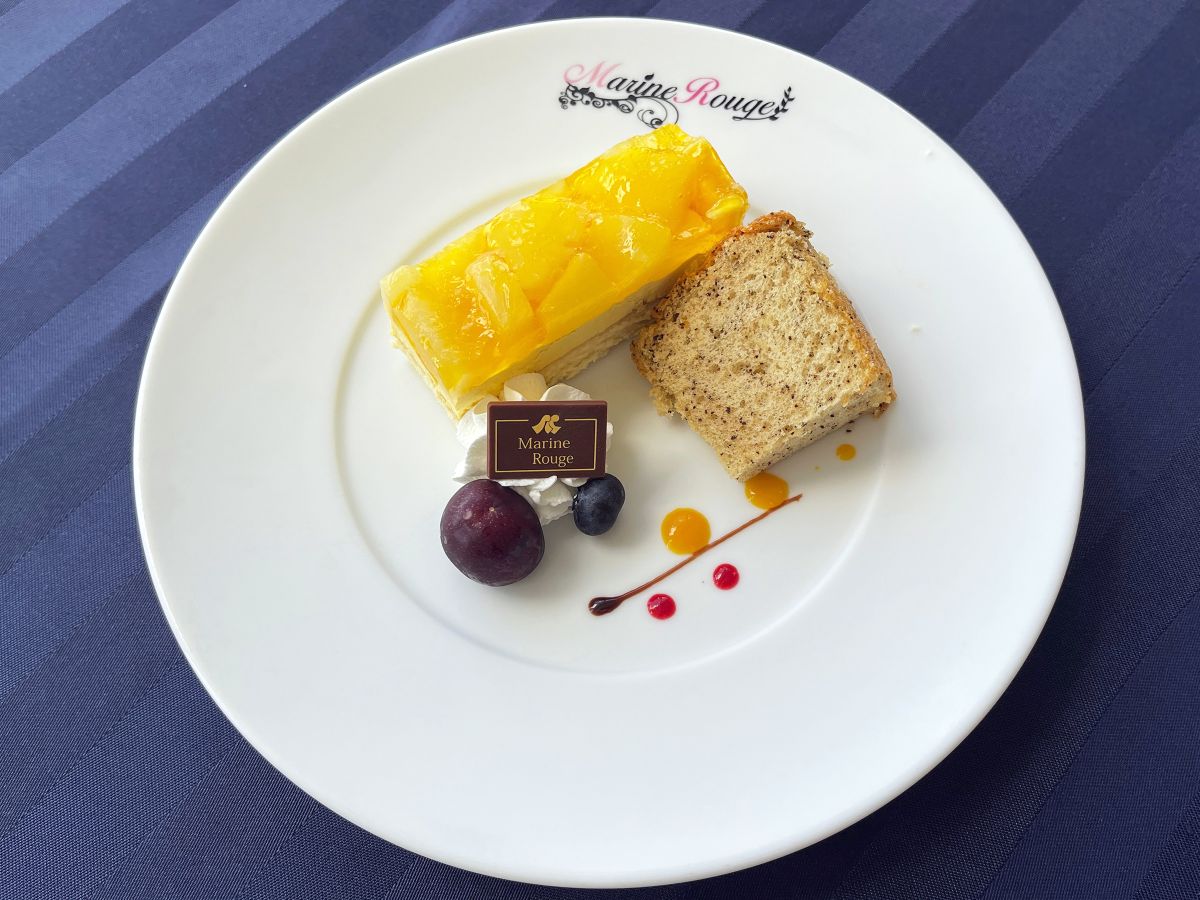 デザートは「パインとマンゴーケーキと紅茶シフォンケーキ」。プレートのロゴもかわいらしく、テンションが上がります。