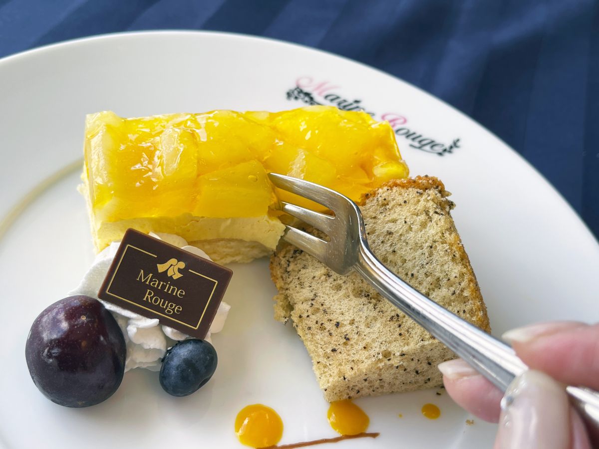 シフォンケーキはふわふわながらも紅茶がしっかり香り、パインとマンゴーのケーキは程よいサイズ感で満足感もバッチリ。