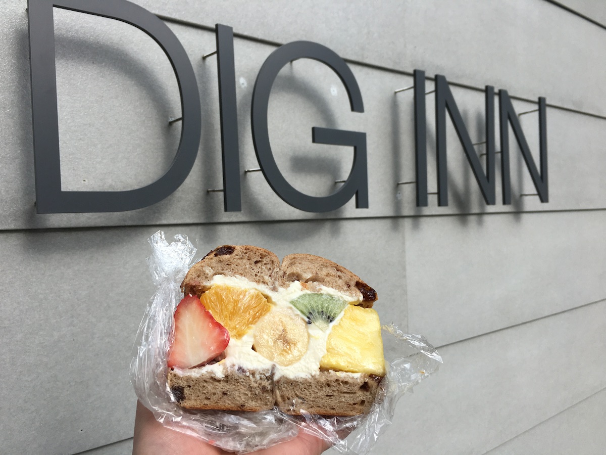 「DIG INN」は、ボリューミーなもちふわベーグルサンドが人気のサンドイッチ店。地下鉄薬院駅から徒歩圏内という都心でありながら、どこから入るか分からないという、謎すぎるロケーションでも話題です。道端に出ている看板を目印に、探検気分で出かけてみて♪