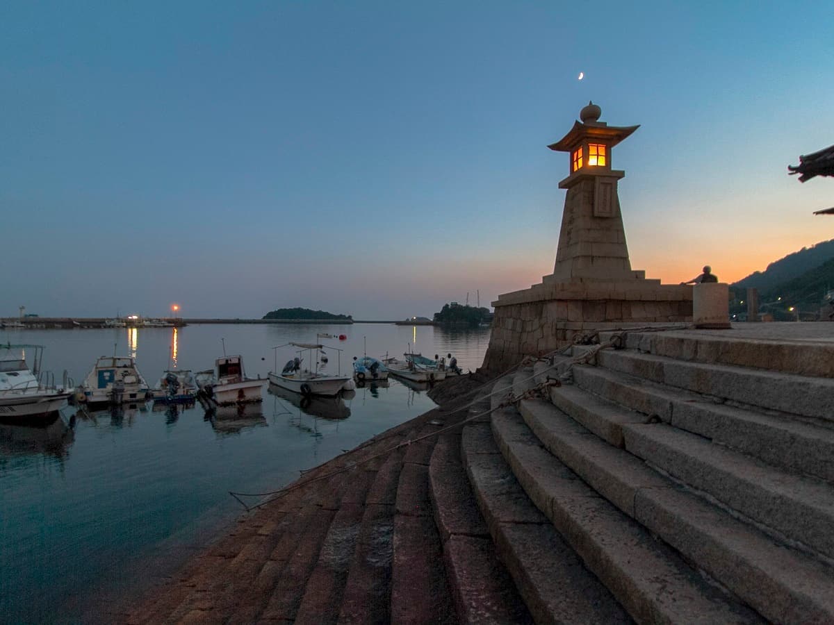 雁木とよばれる石段状の船着き場をはじめ、波止という曲線を描く防波堤や、常夜燈、船番所などの港湾施設が今でも残り、古くからの町並みは国の重要伝統的建造物群保存地区に指定、「近世港町」として文化庁の日本遺産にも認定されています。また、毎年GW期間中には伝統漁法を用いた、観光鯛網が行われています。