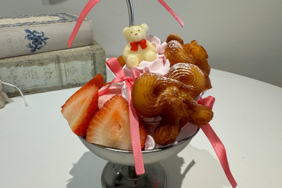 フレッシュなイチゴとイチゴのアイス、イチゴのホイップクリームの上に、リボン型の自家製チュロスやピンクのリボンなどでデコレーション。ちょこんと座っているクマのホワイトチョコがかわいい!