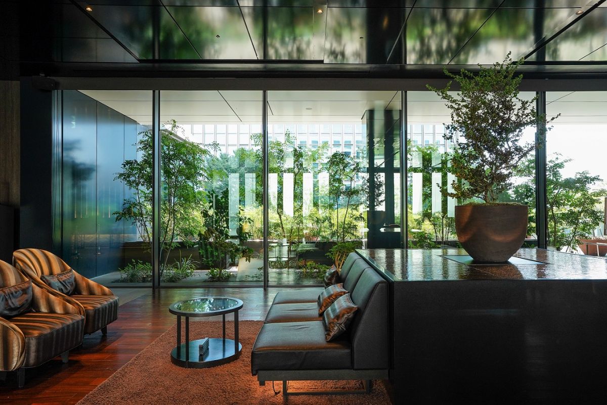 開放感のあるラウンジは中庭やテラスにつながっていて、都心でも自然を感じられるようになっています。きれいに手入れされた草花やテラスのアートを眺めながらしばらくソファでくつろいで、非日常を感じられる素敵な時間を過ごせます。
