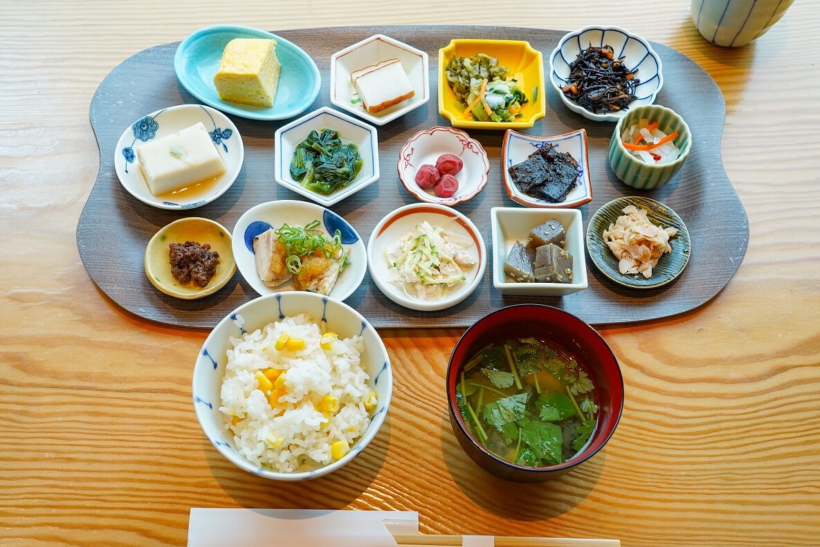 白米は石川県産の「ひゃくまん穀」米、季節の炊き込みご飯はトウモロコシご飯、おかゆも用意されています。炊き込みご飯はタケノコご飯、ホタテご飯、キノコご飯などそのときどきで旬のものを味わえます。