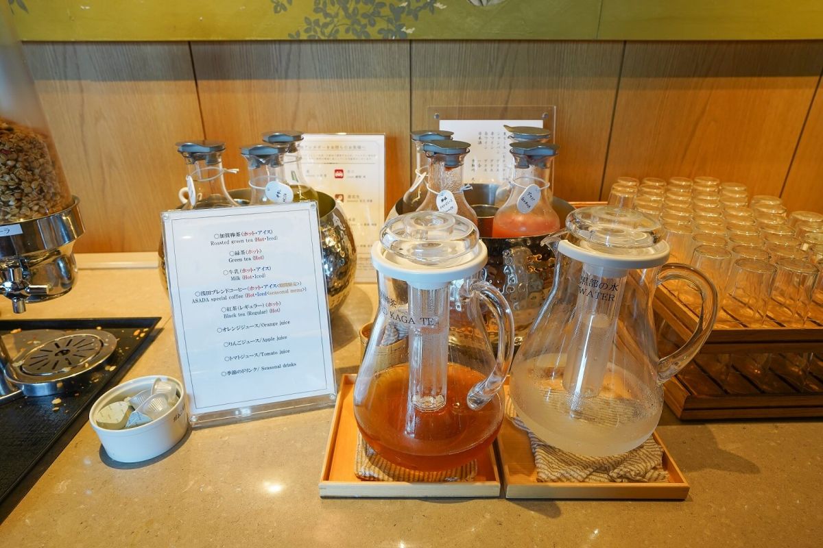 ドリンクの種類も豊富で、加賀棒茶、緑茶、浅田オリジナルブレンドコーヒー、牛乳はそれぞれアイスとホットの用意があり、そのほかにも紅茶、オレンジジュース、リンゴジュース、トマトジュースなど。この日の季節のドリンクはグアバジュース。