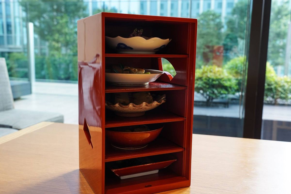「五段弁当」7260円は漆塗りの素敵な箱に入って提供されます。なんて豪華なお弁当…!