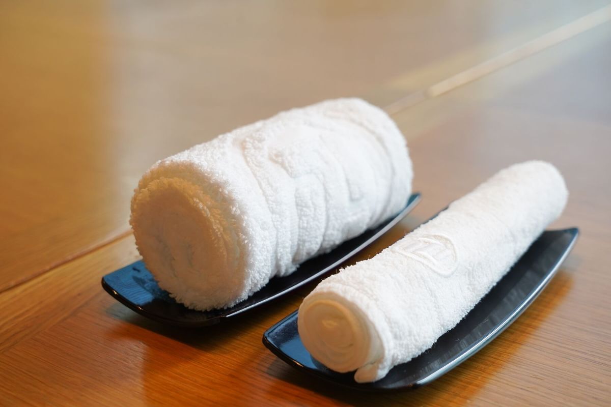 広げて大きく使えるので多くのお客様に好評だそうです。おしぼりにもくずしまんじの家紋が入っています。