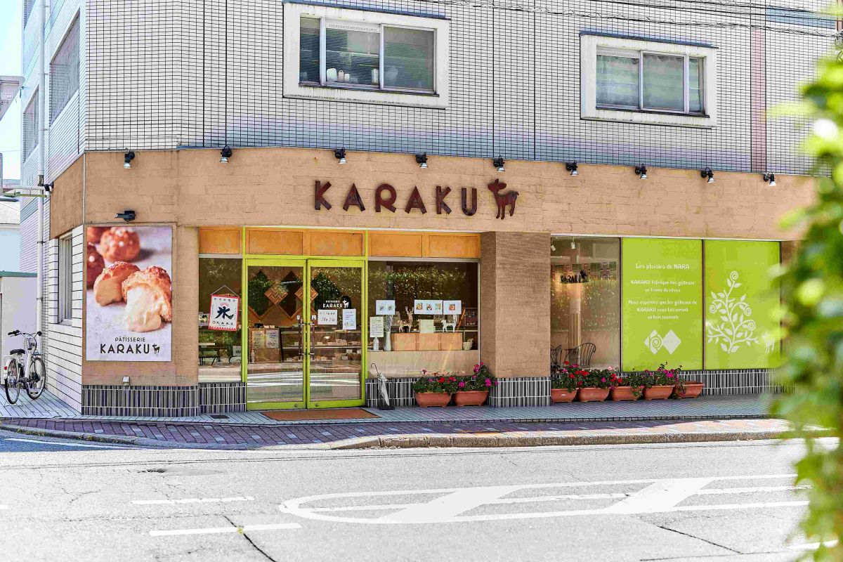奈良県の旧市街地、ならまちを東西に走る「ならまち大通り」と南北に走る「やすらぎの道」。その交差点から西へ180メートルほどのところに「パティスリーKARAKU」はあります。