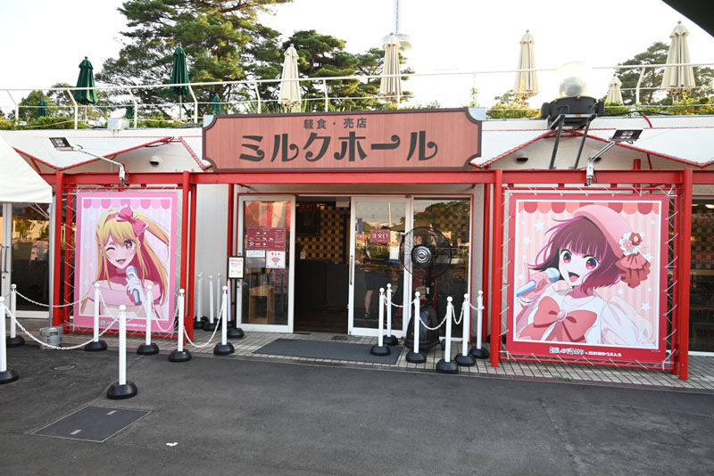 そのほか、レッツゴー!バザールの近くにある「軽食・売店 ミルクホール」では、コラボフードのほかコラボドリンクも販売中。店内には『【推しの子】』のキャラクター達が描かれた旗が掛けられており、食事をしながらコラボイベントを存分に味わうことができるので、ぜひ利用してみてください!