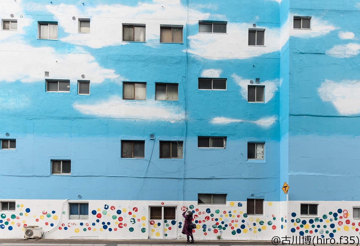 空と雲のアートウォールが写真映え「繊維問屋街」