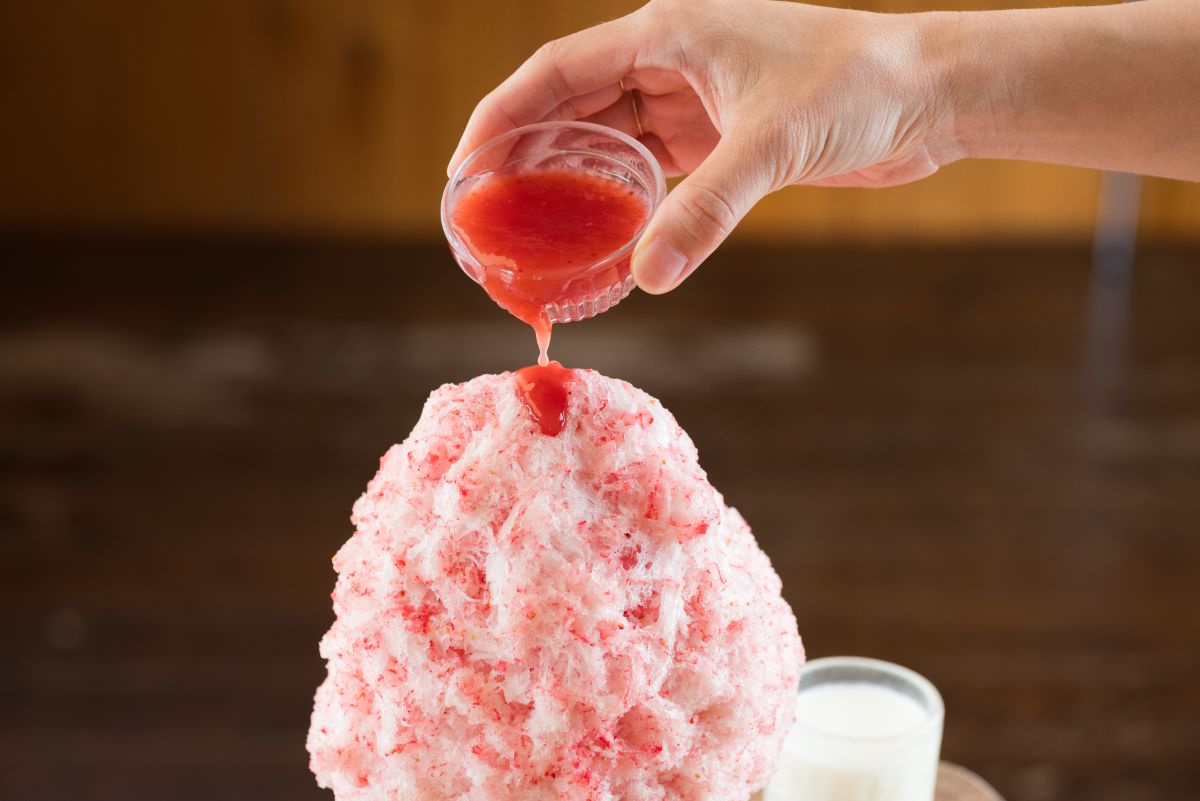 冷凍イチゴを丸ごと削って作る「苺のかき氷」は、暑い夏にぴったりのさっぱりとした味わい。フルーティーな香りと優しい酸味、そして強い甘さが特徴の、静岡生まれのいちご「きらぴ香」を、約1パック分贅沢に使用しています。