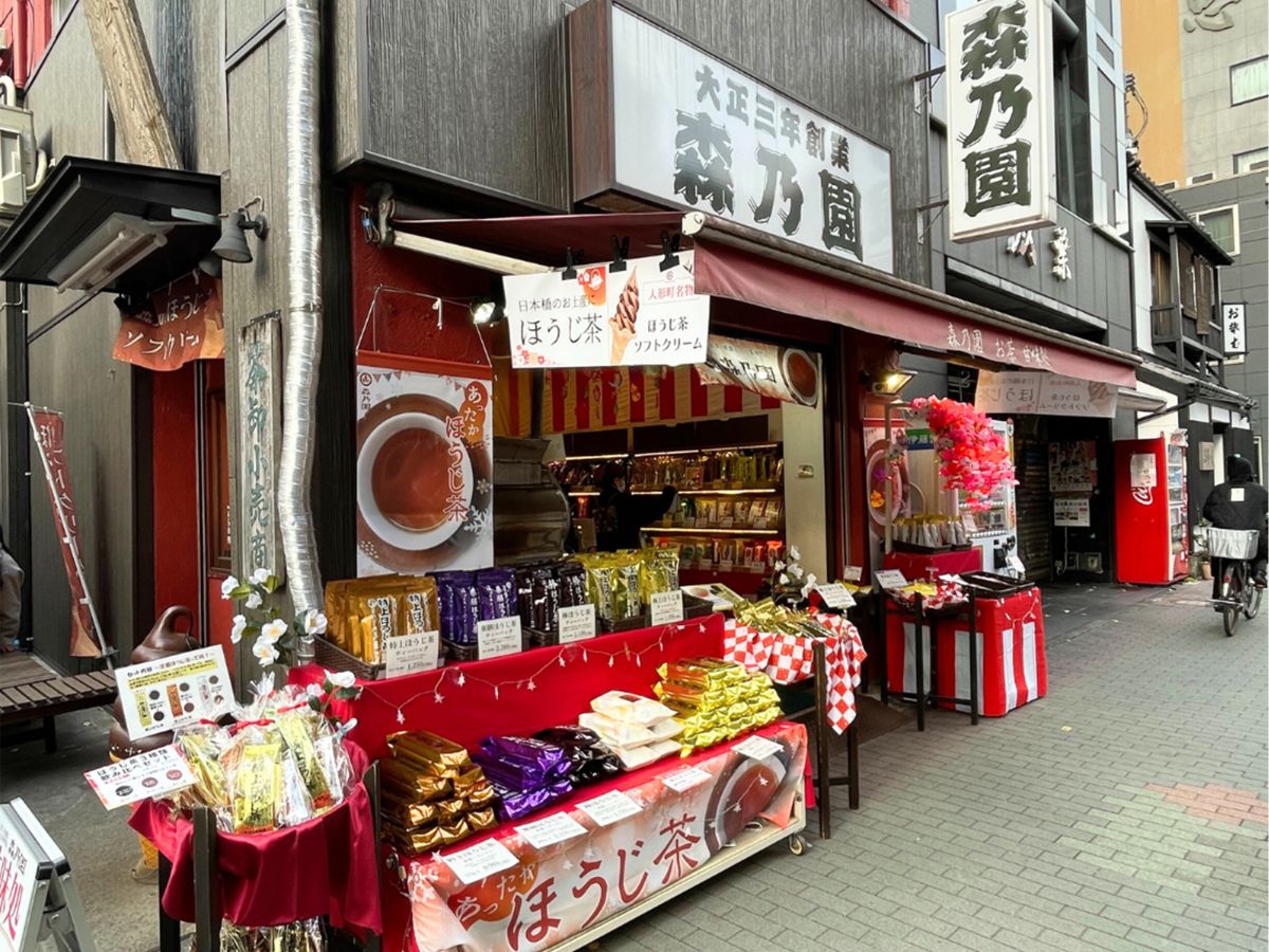 東京メトロ人形町駅、A2出口から徒歩約30秒の好立地にある「森乃園(もりのえん)」は、大正3年(1914)創業の老舗ほうじ茶専門店。数々の老舗や名店が立ち並ぶ「甘酒横丁」の入り口付近に位置しています。
