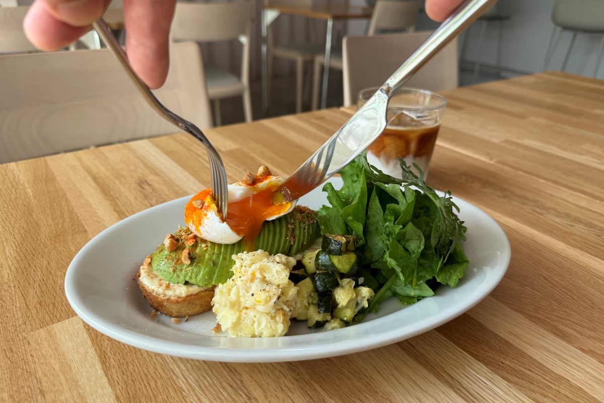 ほんのりゴマが香る自家製パンの上には、自家製のツナ風ペースト、アボカド1/2個分、そしてポーチドエッグとボリューム満点!