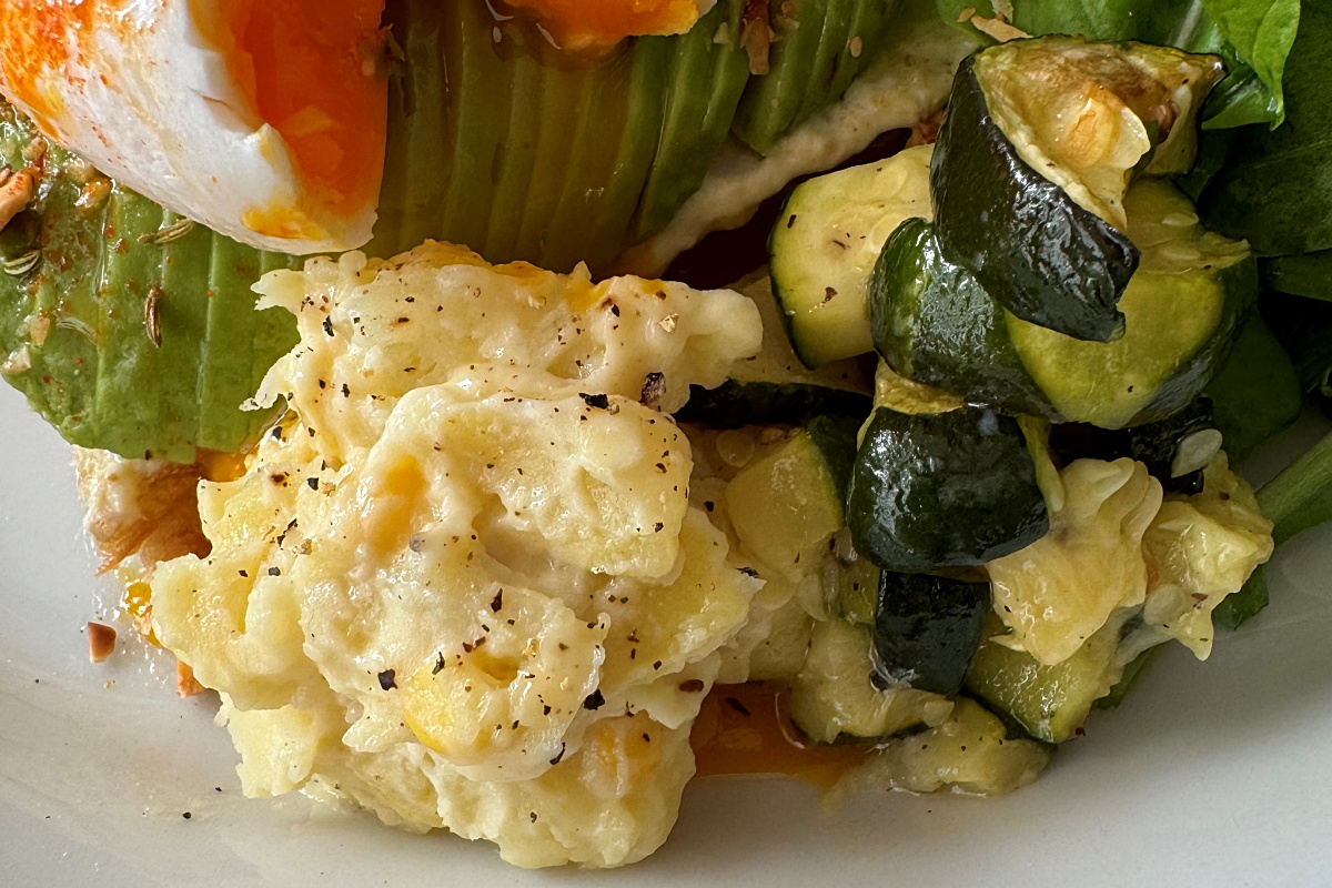 ポーチドエッグに使用しているのは、忍野八海の契約農家から取り寄せる新鮮な卵。ナイフを入れると中から濃厚な黄身がとろ~り。