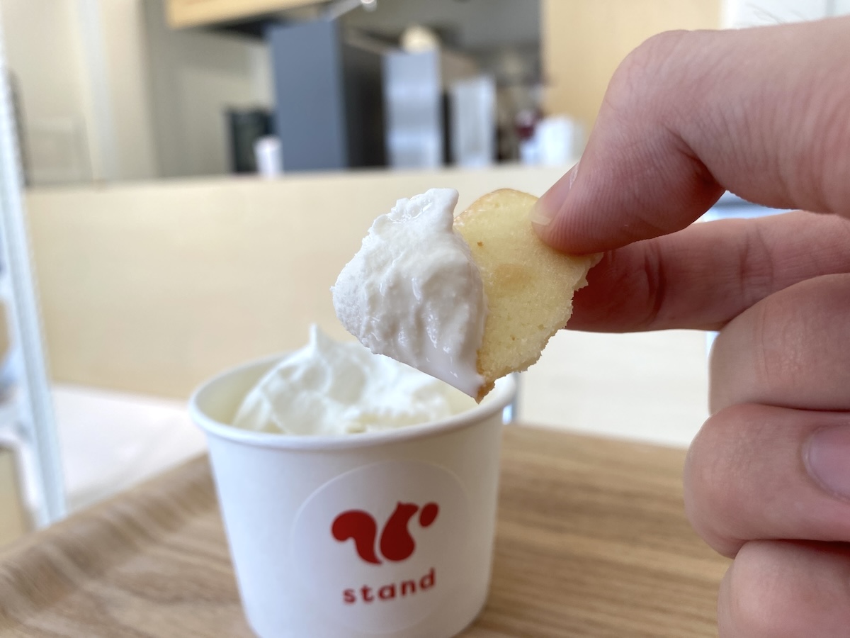 てんさい糖のやさしい甘みが全体のミルキーさを引き立てていて、食べてすぐに十勝ジャージー乳の濃厚な甘さと香りが感じられます。スッと溶けていくほどなめらかな口当たりも魅力です。店内焼き上げのラングドシャが添えられていて、ソフトクリームと合わせて食べると生地の甘みとサクサク食感を楽しめます。60秒を過ぎてもおいしく食べられるので焦らなくても大丈夫です!