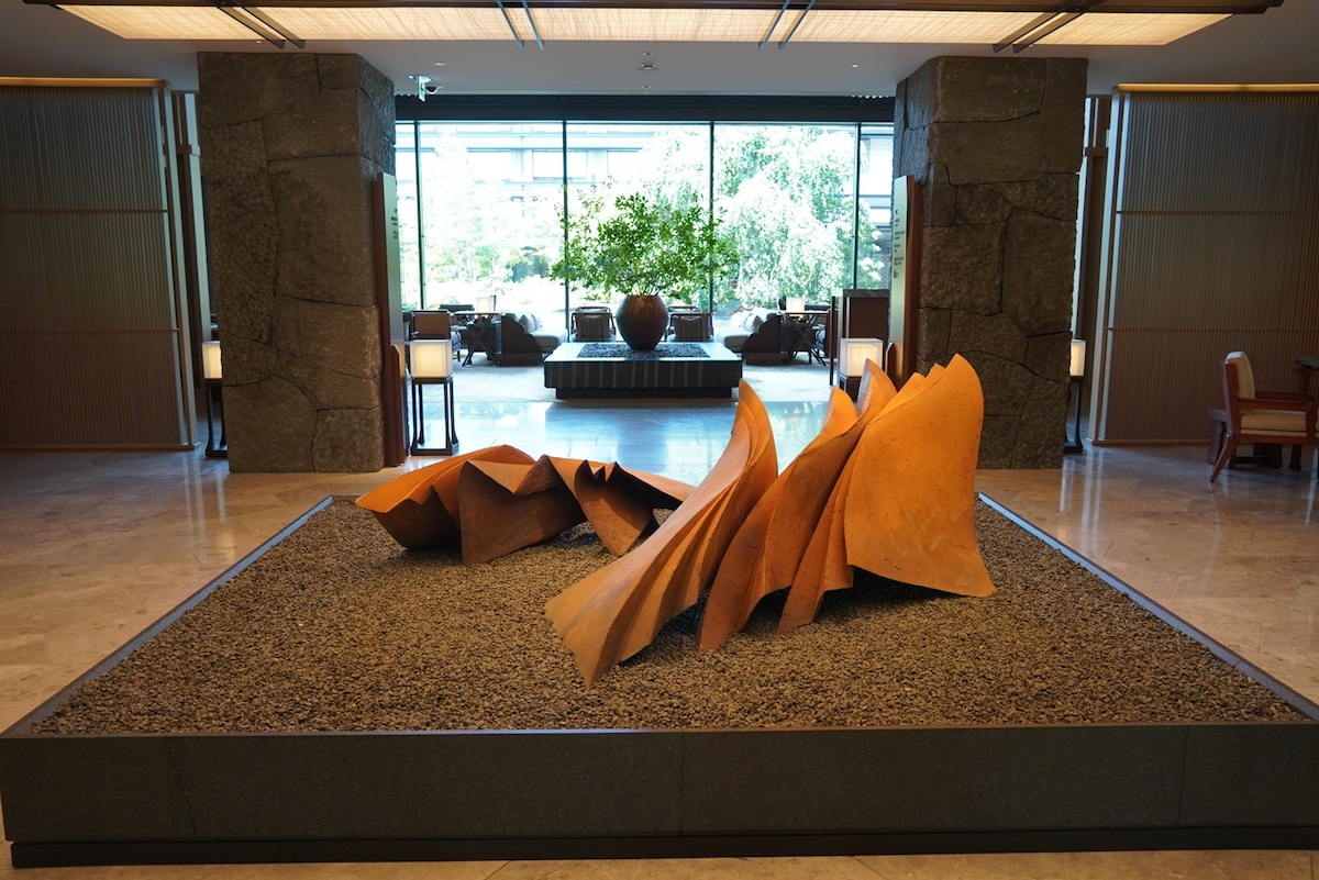 ソファに座ってチェックインの手続きをしながら見上げると、天井にもアートが…。西陣織の帯をイメージした形で、水紋が描かれています。目の前の庭園にある水面が反射されているようで、とてもきれい!