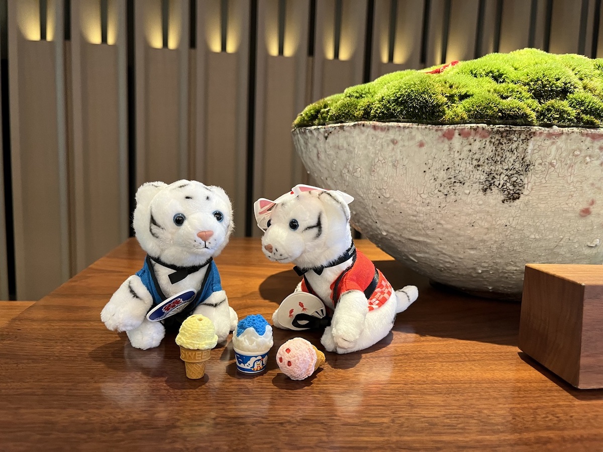 チェックインを終えたら、コンシェルジュに滞在のプランを相談して、希望する人はアクティビティやスパの予約をします。コンシェルジュカウンターにあったのは、白い虎のぬいぐるみ。「京都を四神の方位であらわすと、このあたりは白虎の地域なんです。季節にあわせてスタッフが衣装や小物を用意しています」とコンシェルジュ。小さな気配りに、親しみを感じますね。