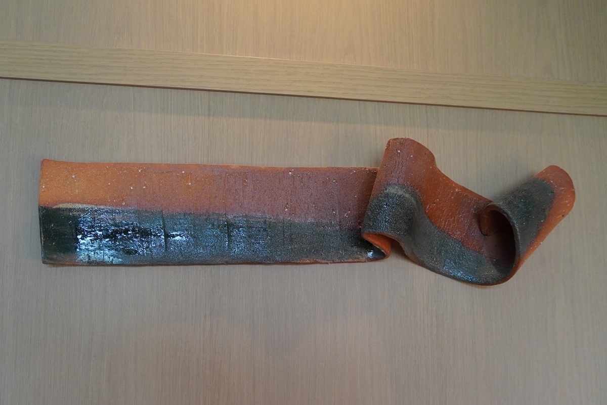 ロビーでは陶芸家・泉田之也(いずみたゆきや)氏の作品が目を引きます。天井照明は和紙を思わせるデザインで、あえて天井を低く設計してあるそう。古い京都の町家の天井が低いことを思い出しましたが、実はそうではなかったんです。