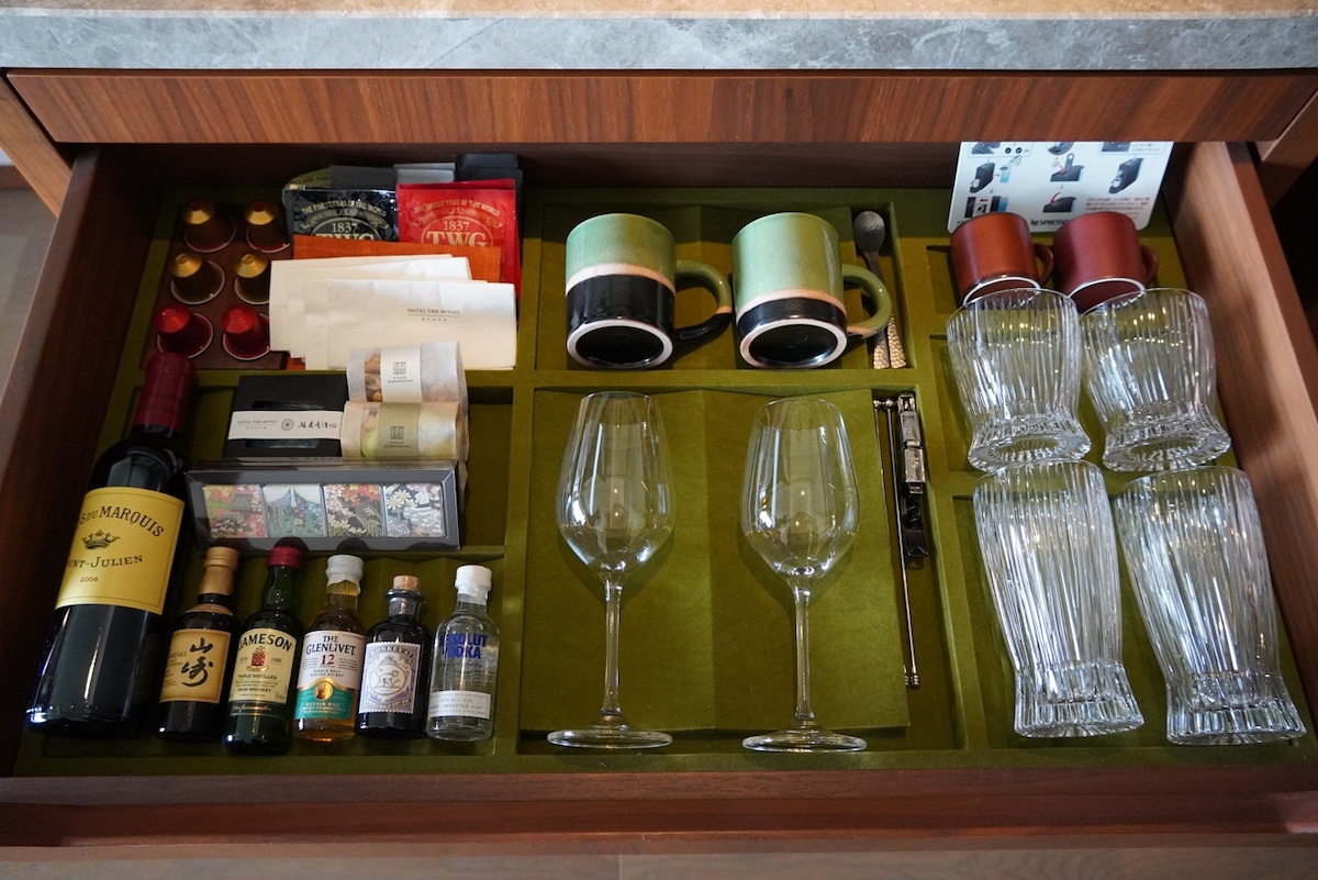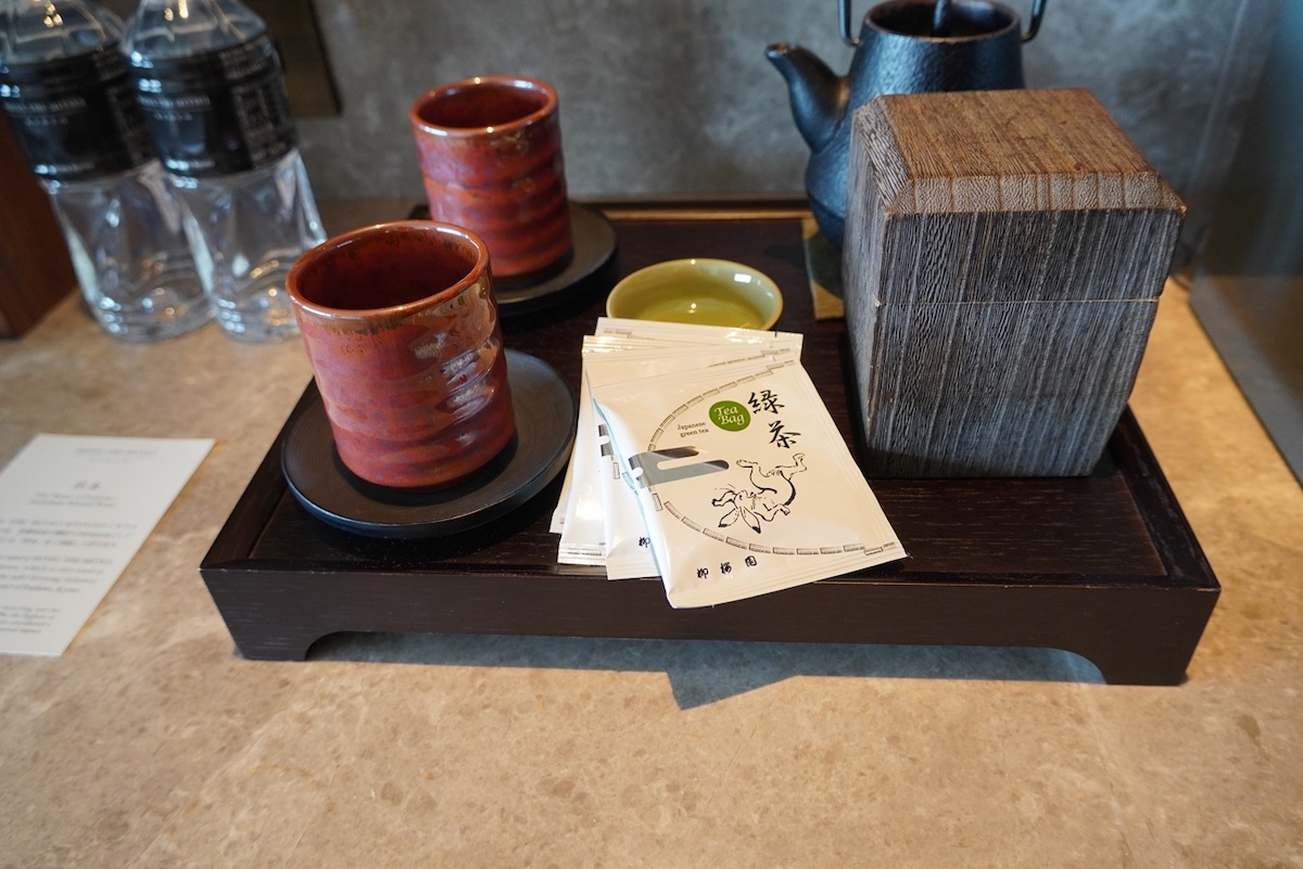 客室に置かれたミネラルウォーターは、酒どころ京都・伏見の酒造りに使われる仕込水、緑茶は老舗の「柳桜園」、紅茶は「TWG」です。