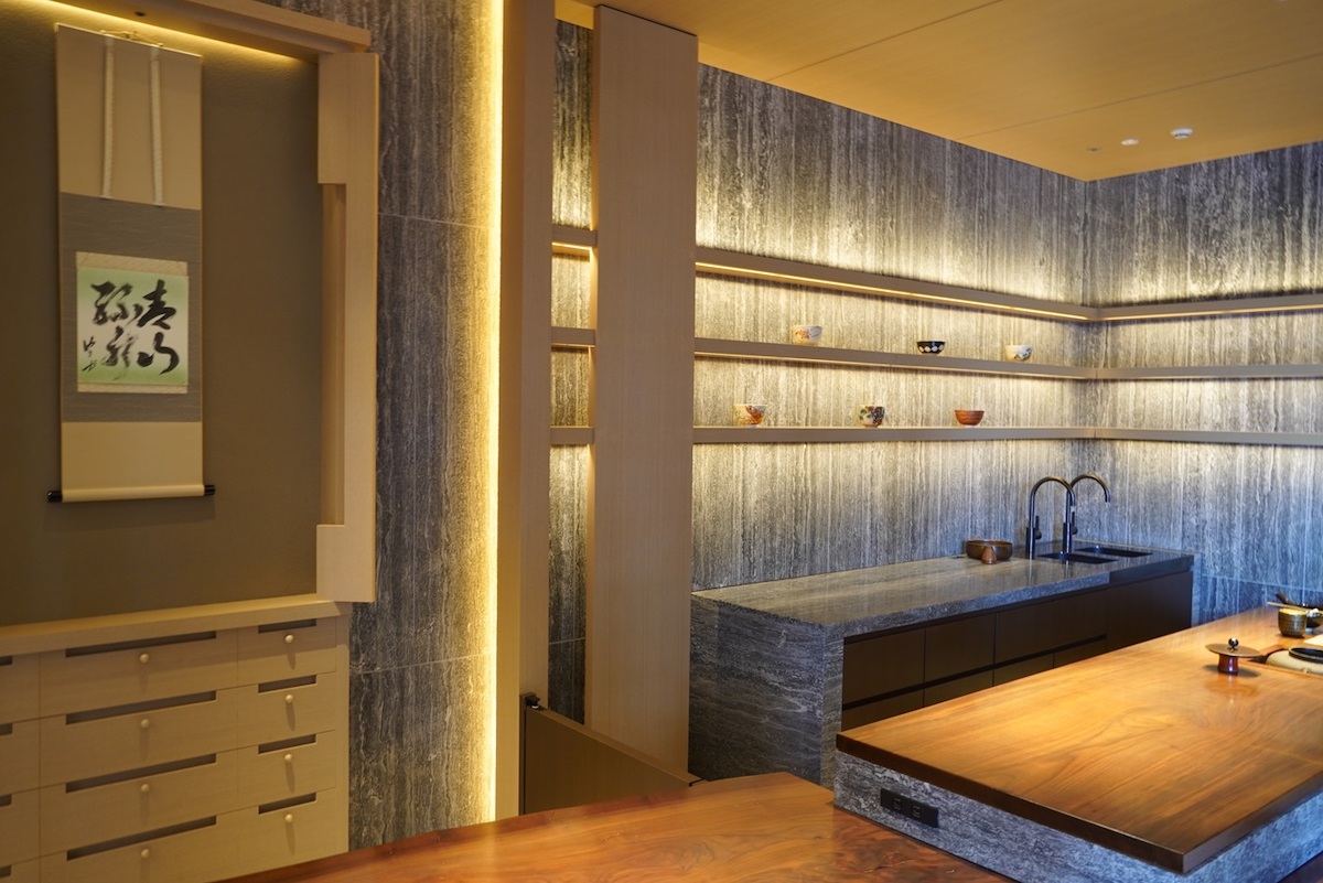 壁のオブジェは三井家が保有する茶碗をモチーフに展開したもの。文化の継承を感じます。