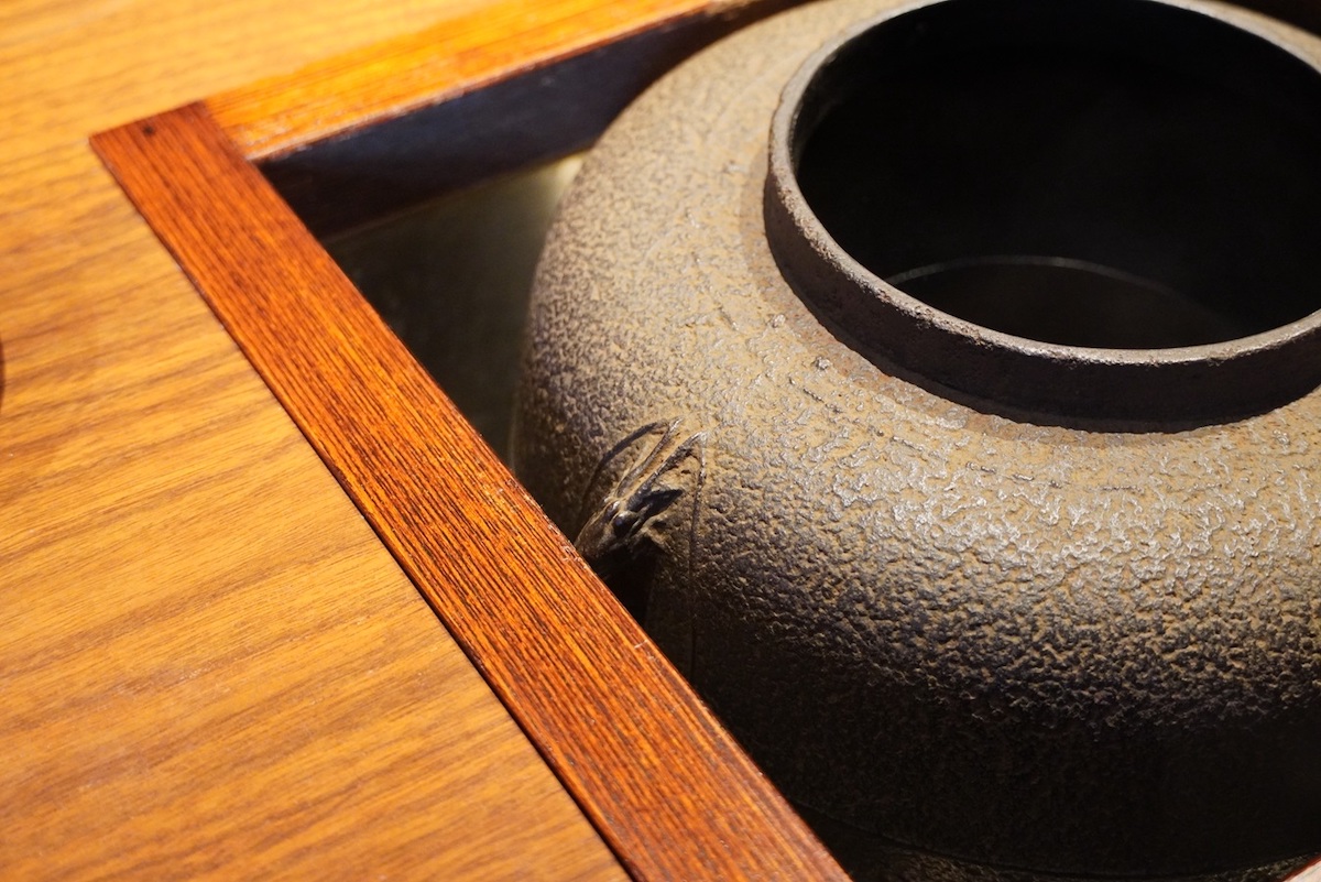 炉口には、梶井宮門に使われていた約300年前の端材が使われています。釜にはエビがあしらわれて、ちょっとした遊び心にときめきます。