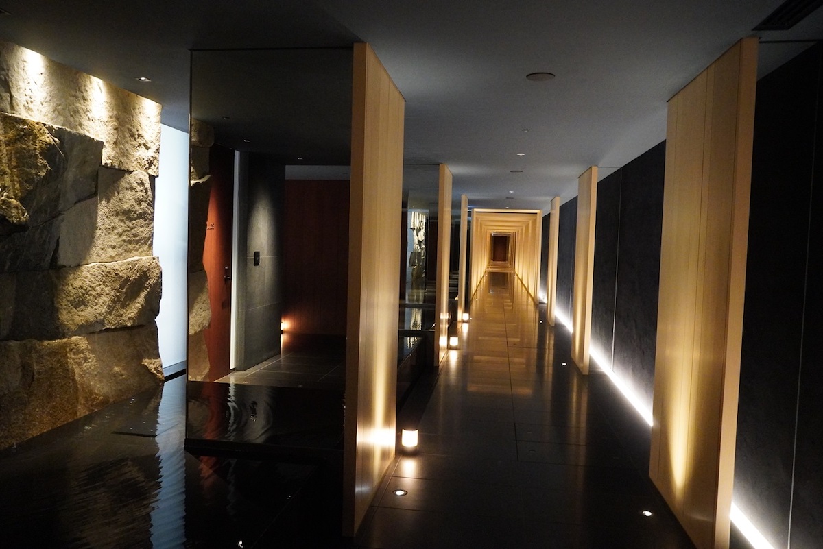 地下に降りると、明かりをおとした廊下が奥に続いて、まるで異空間に迷い込んだよう。静けさと水音で、徐々に心身がクールダウンしていきます。