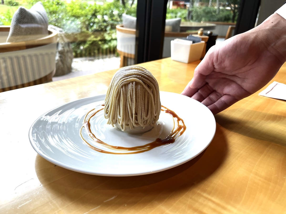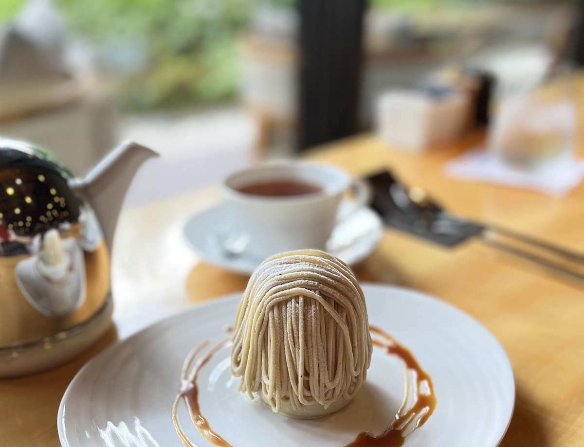 ティータイムにケーキセットをいただきました。ケーキは、本日のフルーツショートケーキ、チョコレートムース、バニラチーズケーキ、モンブランの4種類(各1900円)。今回は、京丹波栗を使ったモンブランを選びました。