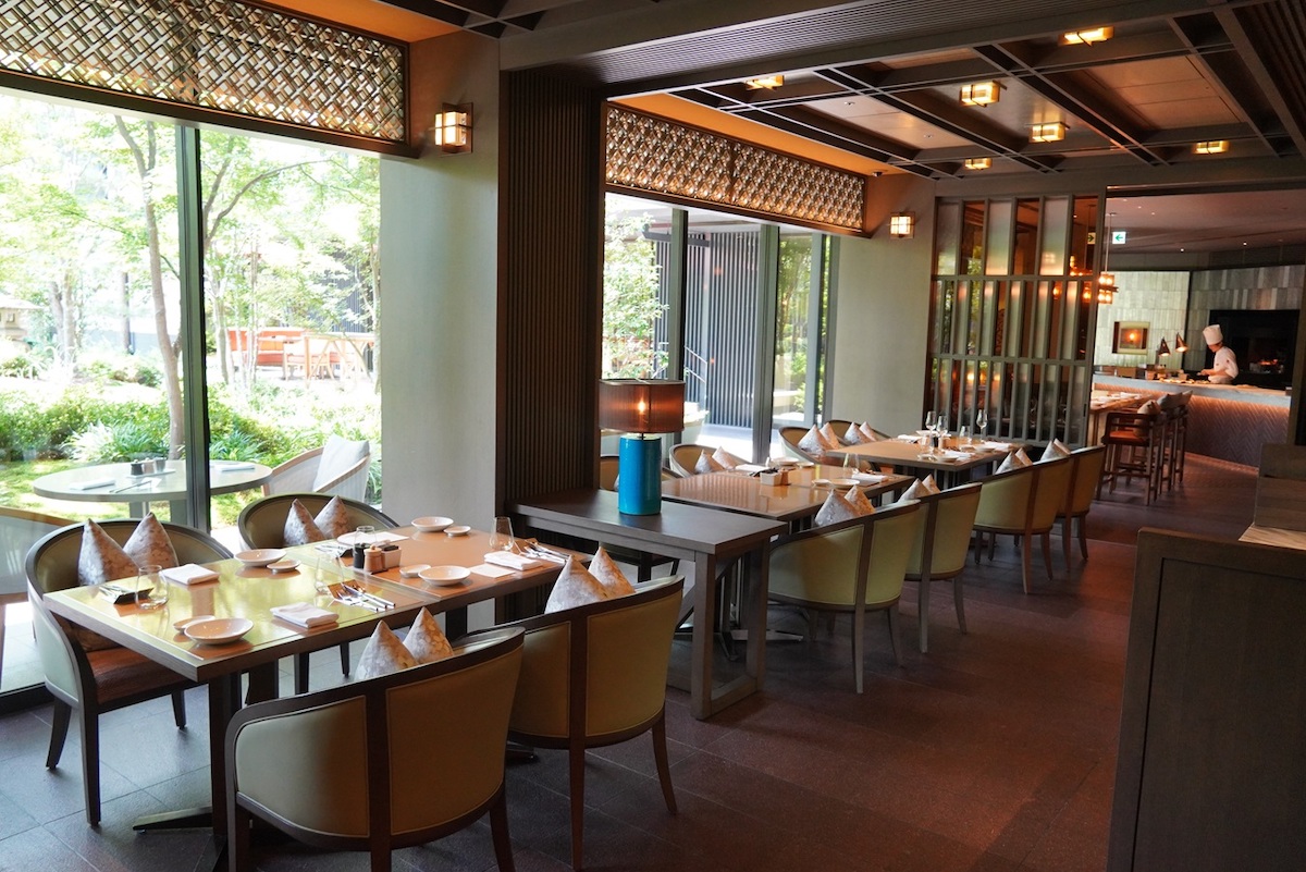 奥にあるロビーラウンジに進むと、美しい庭園が目に飛び込んできました。高い天井と大きなガラス、ロビーとの高低差に感動もひとしお。ロビーの天井が低かったのは、このための演出だったんですね。