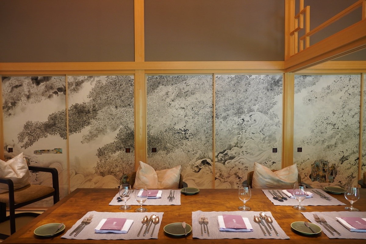 中庭に立つ「四季の間」は、三井家が客人をもてなしていた奥書院を継承して建てられた総檜造りの離れです。レストランの別室として利用でき、和室に絨毯、椅子席というのも三井家時代と同じだそう。襖に描かれた日本画は、庭園の春夏秋冬がテーマ。炉が切ってあるので、お茶席としても利用されています。