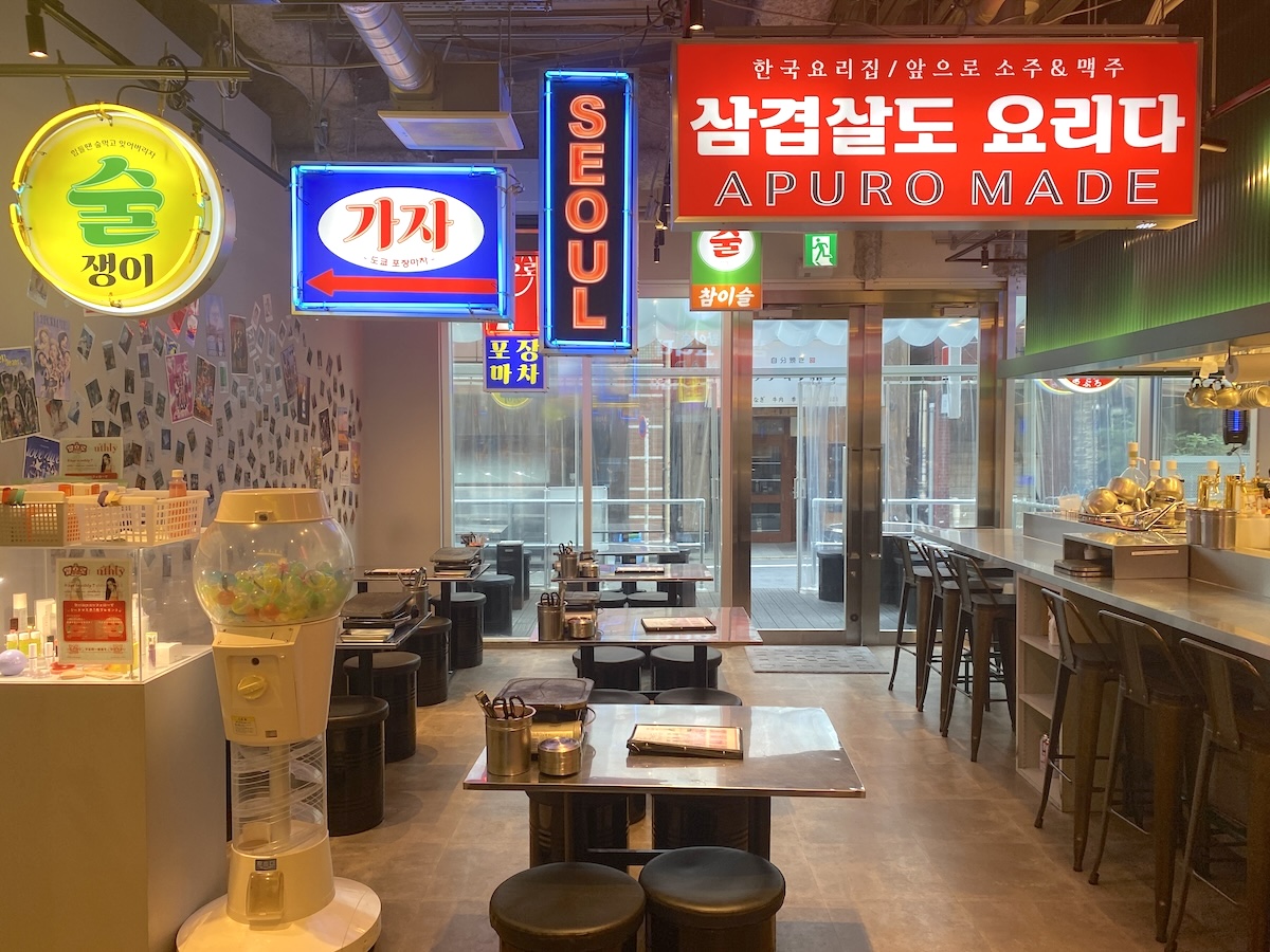 ネオン看板やテーブル、カラトリーなどの備品はすべて韓国製にこだわっており、足を踏み入れた瞬間からまるで韓国に来たかのような雰囲気を味わえ、まさに小さな韓国です。席数は1階がテーブル13卓とカウンター12席、2階がテーブル16卓で広々としています。