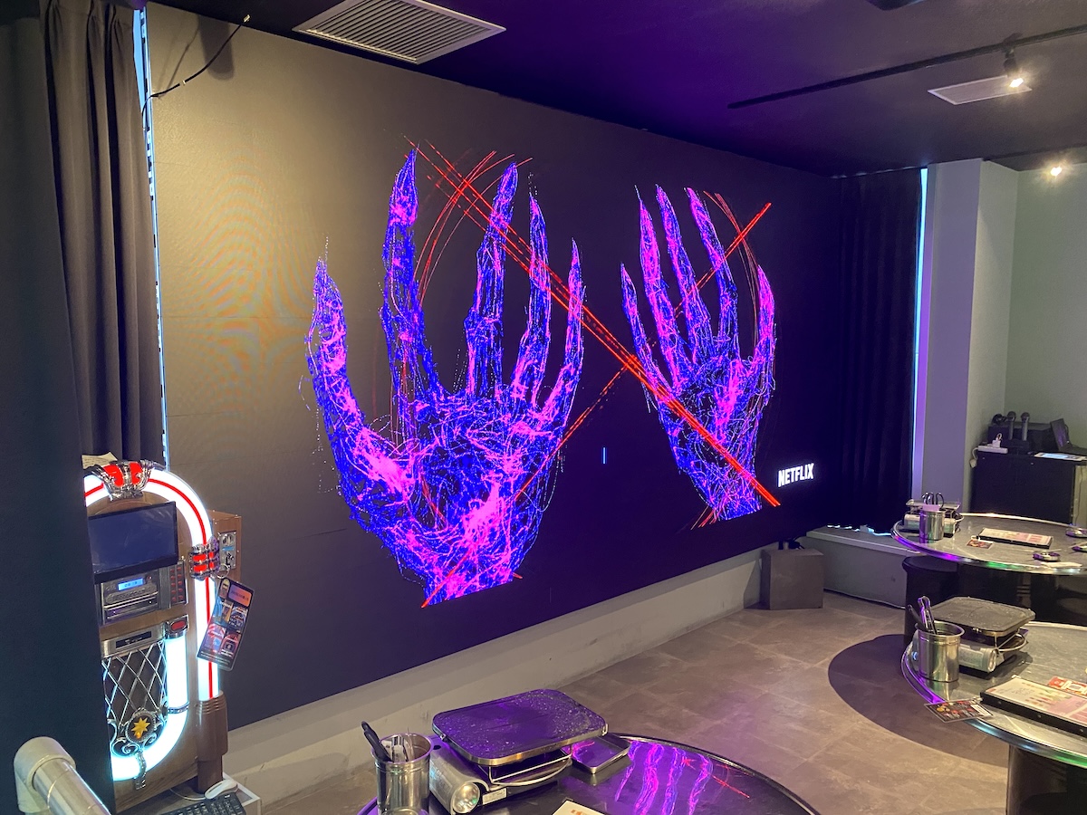 2階ではジュークボックスで音楽をかけたり、壁一面のデジタルサイネージでミュージックビデオを眺めながら食事をしたりできます。ジュークボックスは対象ドリンクをオーダーすると貰える専用コインで利用可能です。