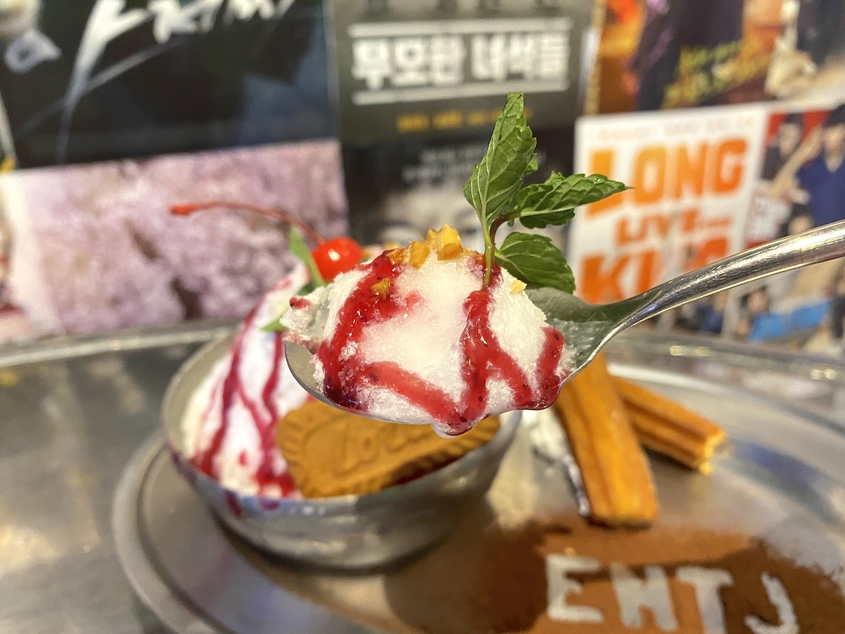 ピンスは韓国版のかき氷。ただ作り方は日本のかき氷と大きく違って、氷を削るのではなく水と牛乳と生クリームを合わせた液体を冷却された専用の回転機械に垂らして削っていき、ふわふわでさらっとしたパウダー状に仕上げます。氷自体に味がついているのでトッピングがなくても楽しめるのも特徴です。
