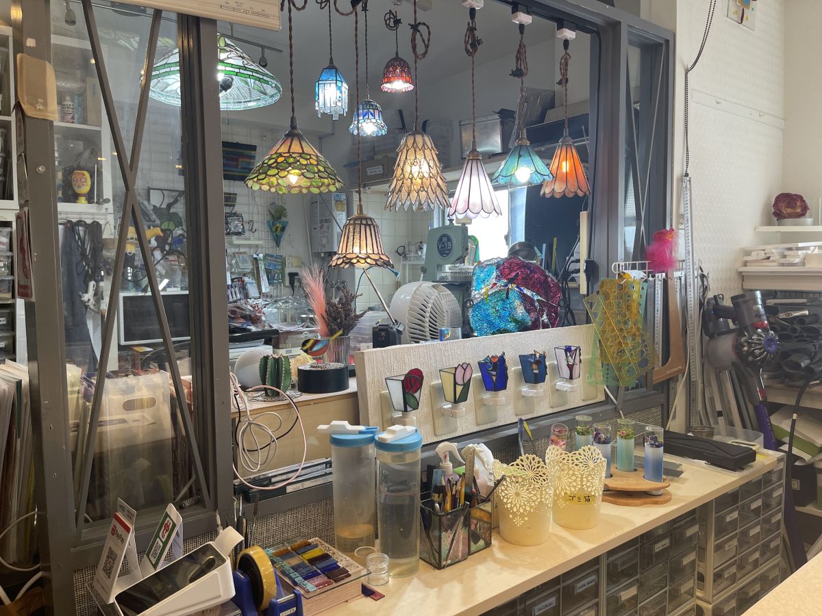 また、「まんげ鏡や」は、ステンドグラス教室やワークショップを開催している「世田谷ステンドグラス美」に併設されているため、工房にはステンドグラス作品もたくさん。光が当たるとキラキラと輝くステンドグラスも美しいので、訪れた際はこちらにも注目です。