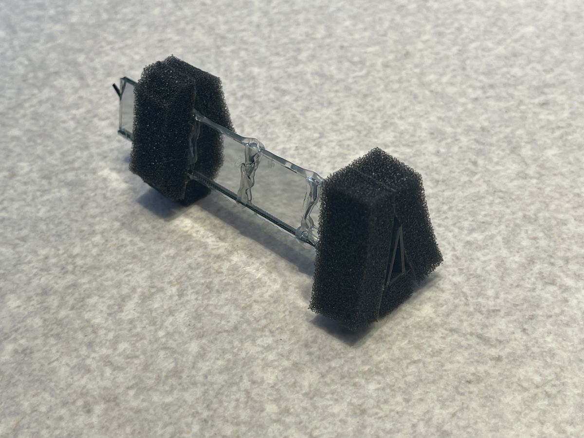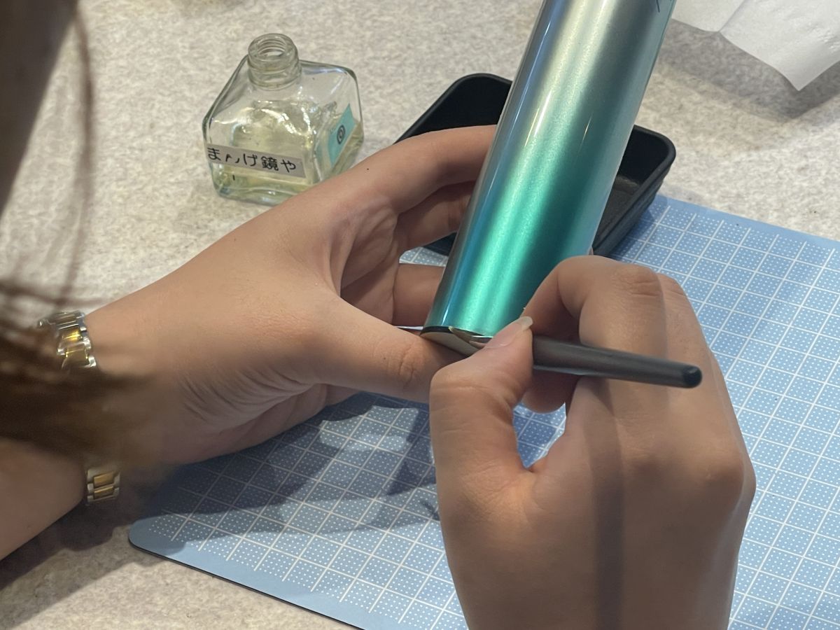 鏡を選んだら、周りにクッションテープを付けていきます。これは本体の中で鏡が動かないように固定するためのもの。2カ所に貼り付けたら本体にピッタリ収まるように余分をカットします。鏡の中に指紋や埃が付いてしまうとそれもずっと反射してしまうので、細心の注意を払いながら慎重に……。