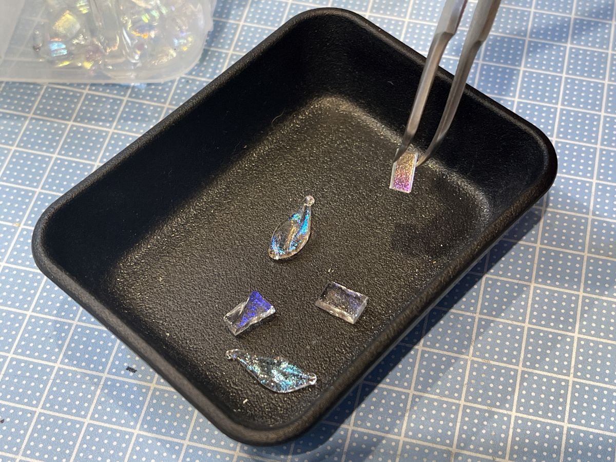 一見、透明でどれも変わりがないように見えますが、光が当たると水色やネイビー、桃のようなピンクと黄色が合わさった色など、カラフルに輝きます。のぞいたときにどの色がメインで見えるようにするかを考えて選ぶのがポイント。今回は、ブルーベースの見え方にするために、水色やネイビーのダイクロガラスを中心に選びました。