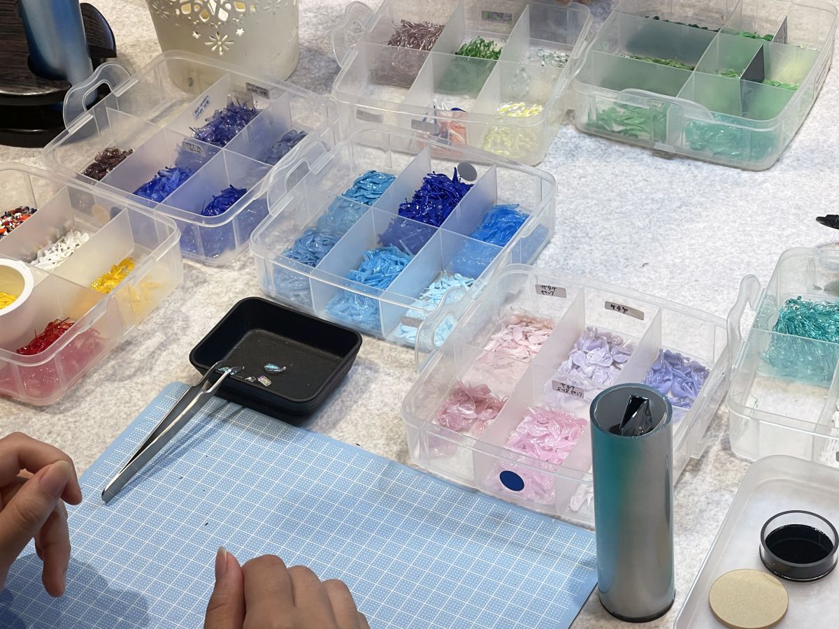 本体の準備ができたら、万華鏡作りで一番のお楽しみのオブジェクト作りに取り掛かります。このオブジェクトが鏡に反射することで、キラキラと輝く世界を作り出しているんです。