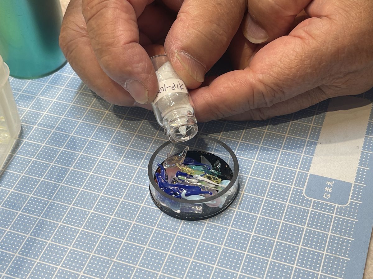 ガラスパーツを選び終わったら、輝きをさらにプラスするオパールパウダーを20粒ほど入れます。輝きを抑えたい場合は入れないことも可能なので、先生と相談して決めてくださいね。