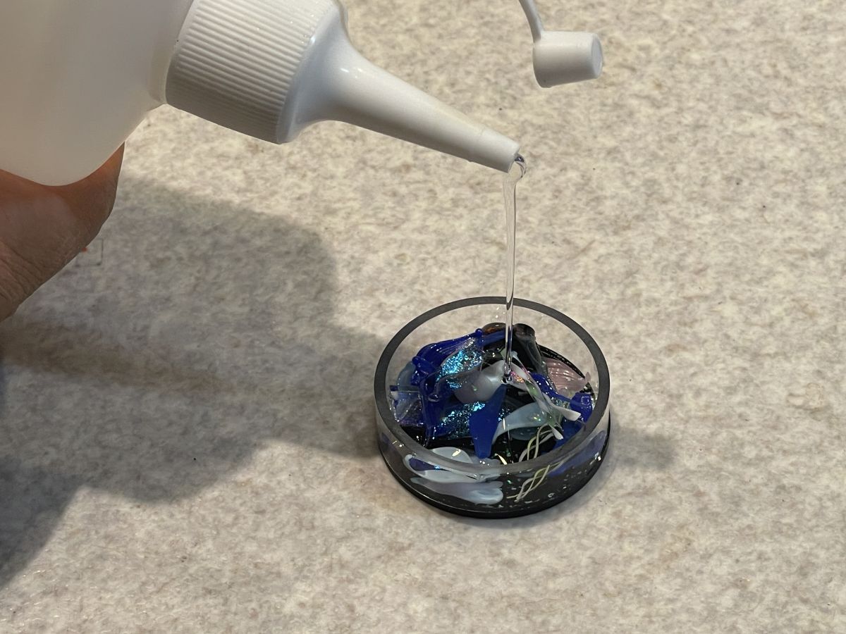 最後にオイルを入れて、オブジェクトの完成です。気泡が入ったままだと見え方に影響するので、爪楊枝を使ってていねいに取り除きます。オパールパウダーが隅に張り付いてしまいがちなので、パウダーをオイルに浮かせるのも忘れずに。