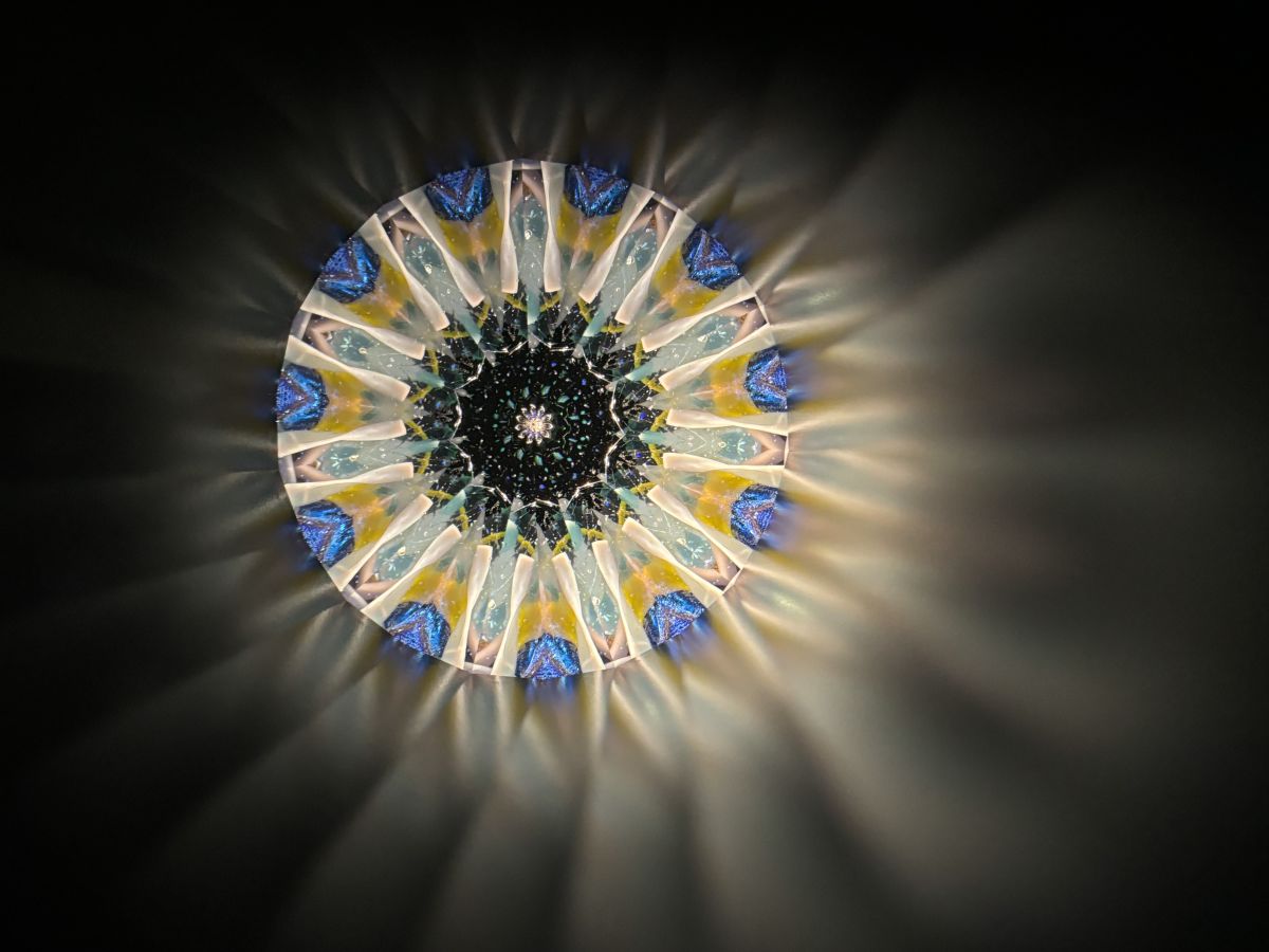 完成した万華鏡の見え方はこんな感じ。目標どおり、ブルーベースの輝きに仕上がりとってもうれしいです。アドバイスを受けて入れた黄色のガラスパーツも、リボンのように絡み合うデザインに見えて素敵です。
