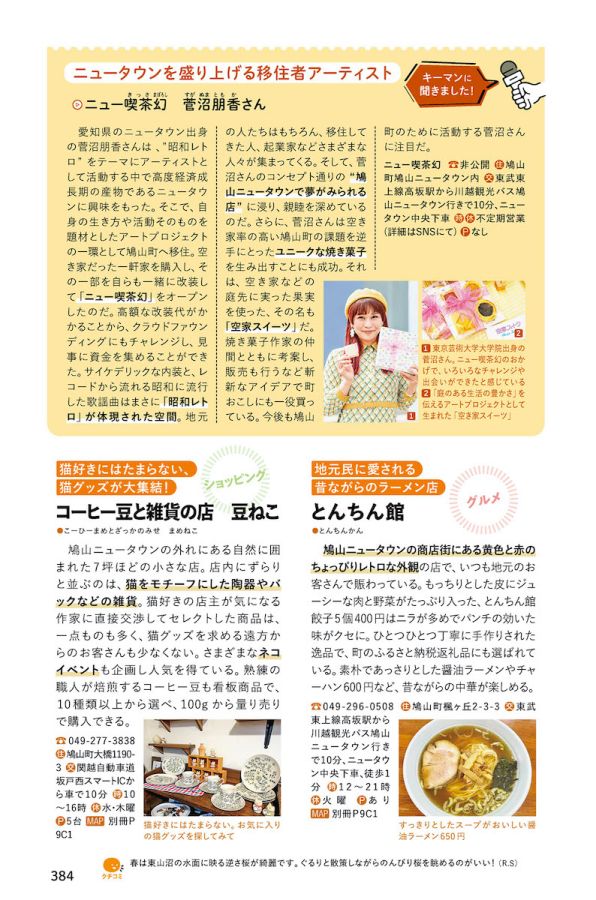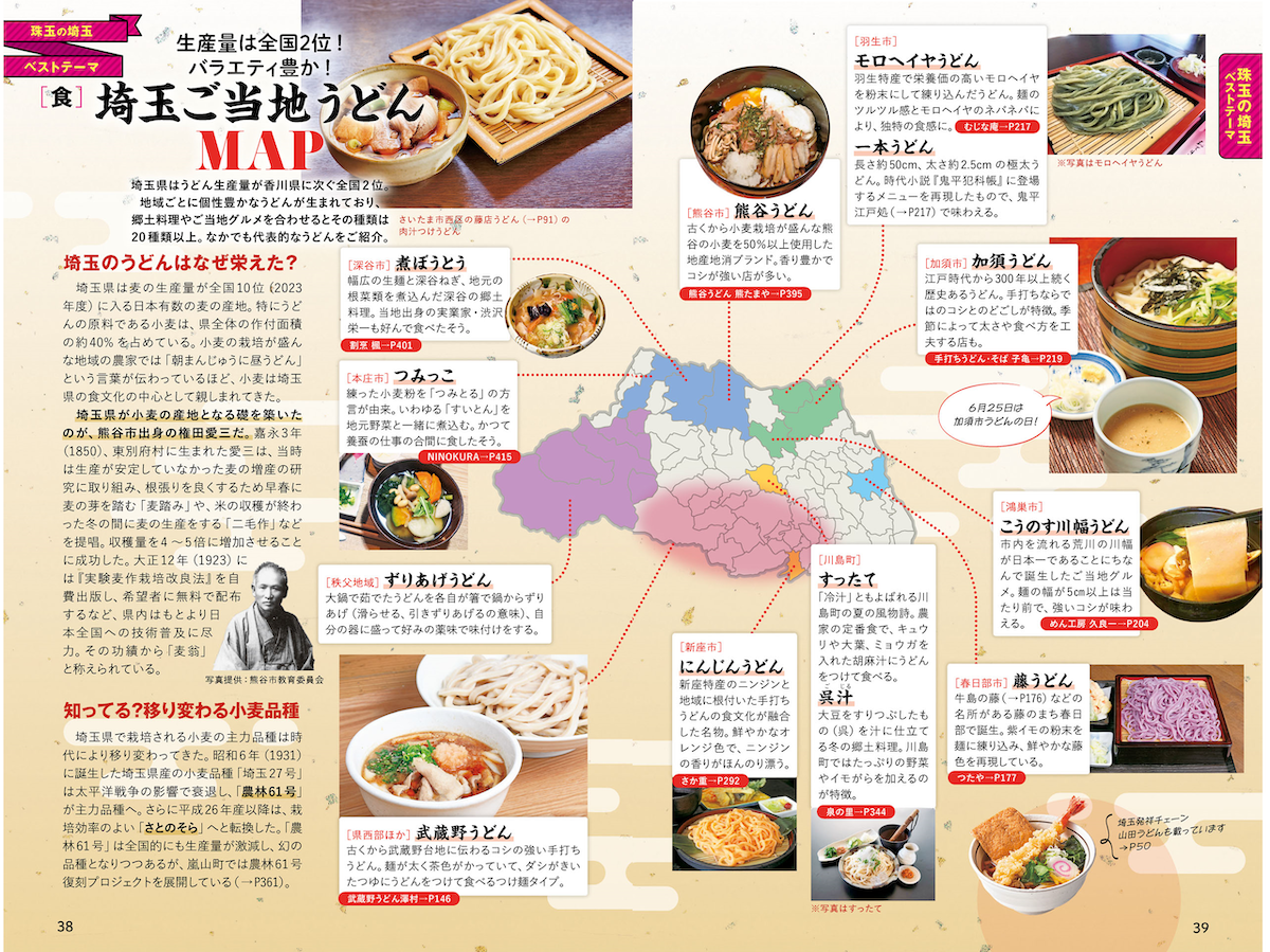 埼玉県が誇るグルメといえば、地域色豊かなうどんが有名ですね。このように、季節ごと、ジャンルごとに埼玉県全体のみどころを紹介するページも。一家に一冊持っていれば、埼玉県のあらゆるまちへ行きたくなる、おでかけガイドの決定版です。