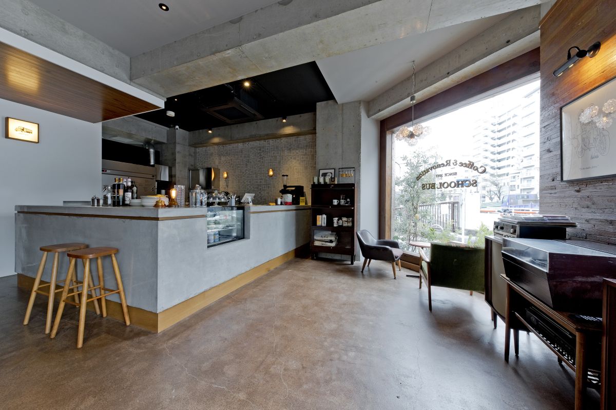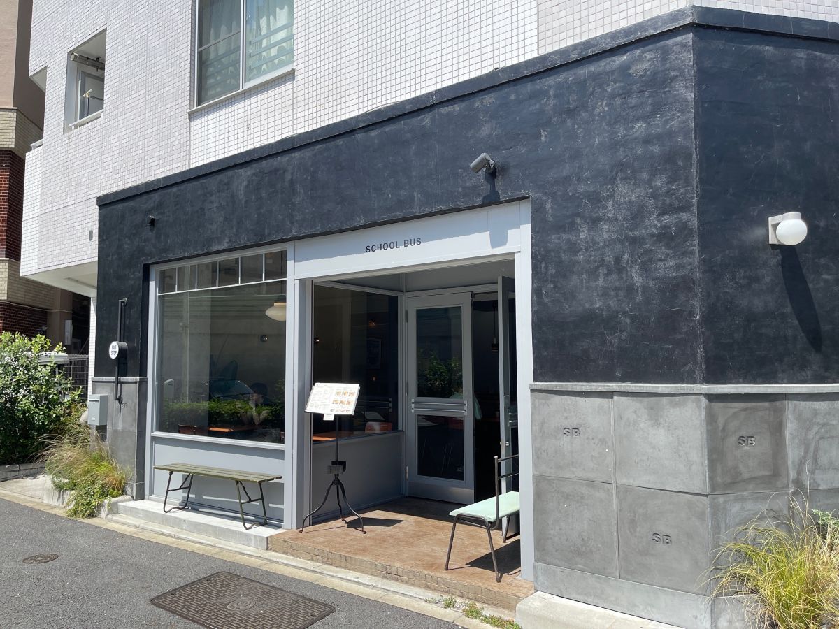 東急線・池尻大橋駅から徒歩約10分、中目黒駅からは徒歩約15分ほど。「SCHOOL BUS COFFEE STOP NAKAMEGURO」があるのは、山手通りと目黒川が交差する桜の名所、目黒橋のほど近く。関西発の、アメリカンスタイルをコンセプトにしたリノベーション会社「SCHOOL BUS」が手がけるカフェです。