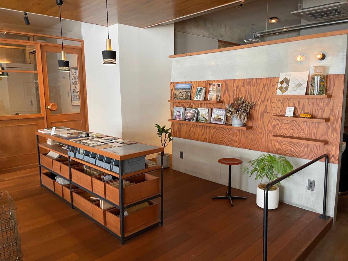打ち合わせブースを備えたリノベーションスペースや、建材の展示コーナーも用意されています。