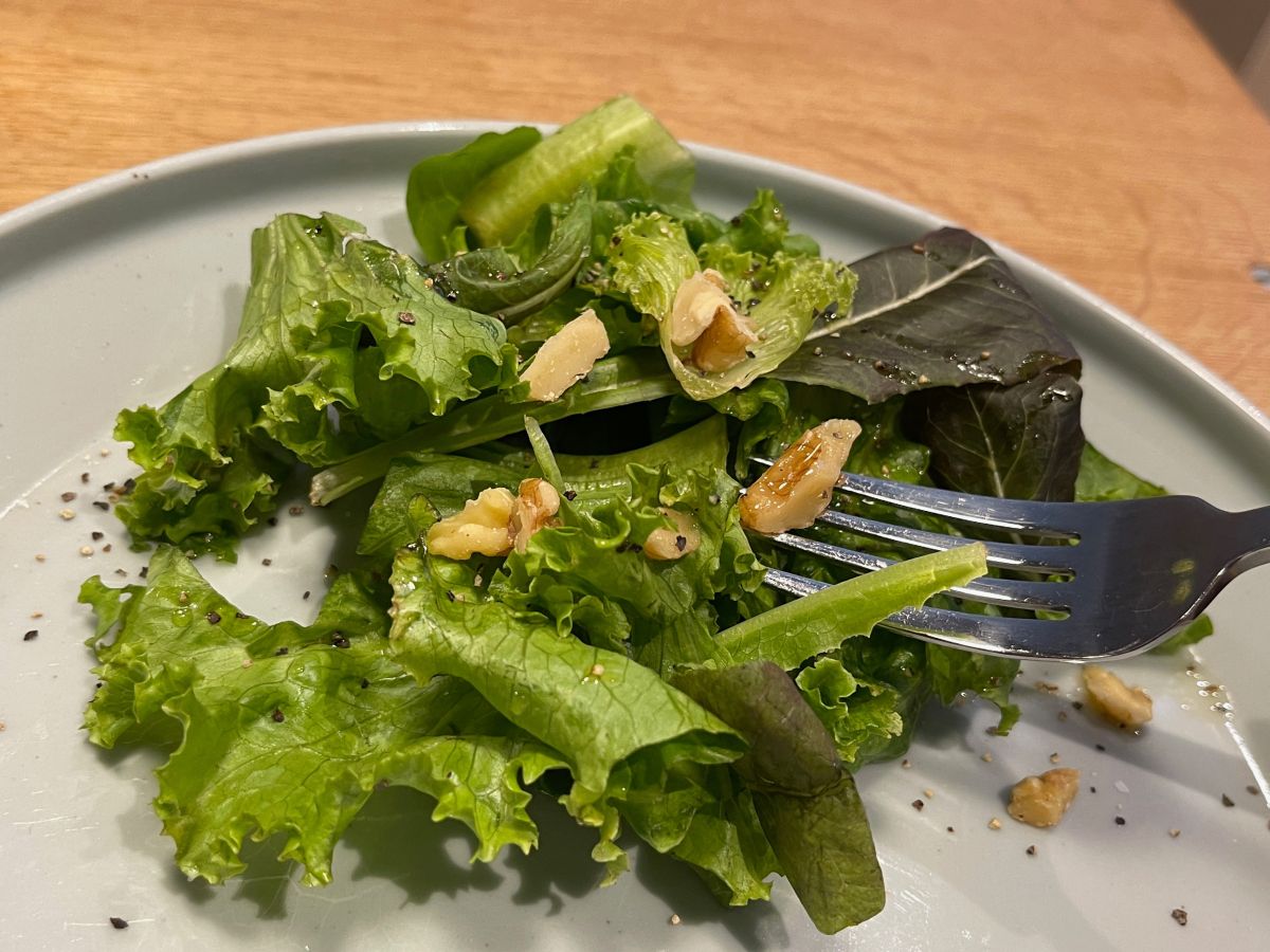 サラダの味付けはシンプルにオイルと塩、ペッパーのみ。ナッツとオレンジがアクセントのさっぱりしたサラダです。