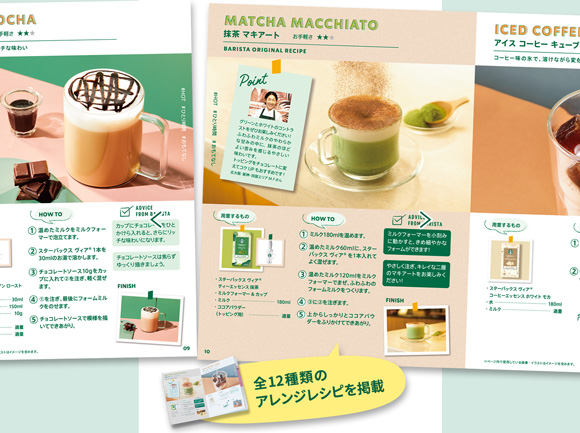 抹茶マキアートなど、スターバックスのバリスタが特別に用意したオリジナルレシピ3種類が掲載されています。おうちでのカフェタイムがもっと楽しくなること間違いなし! そんなレシピブックで、ぜひお気に入りのアレンジを見つけてみて♪